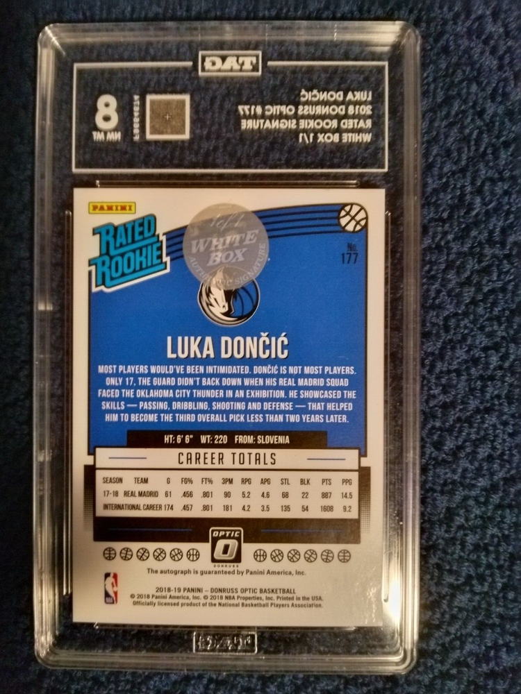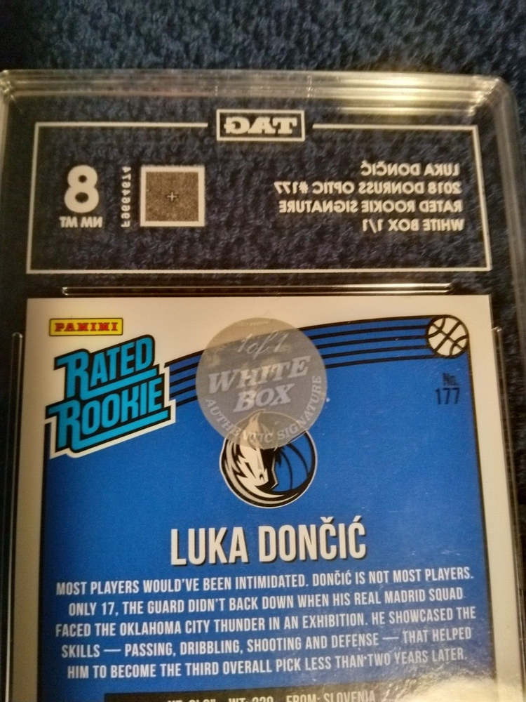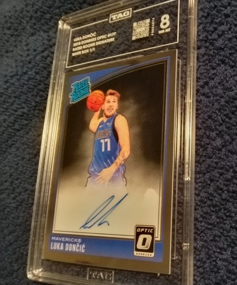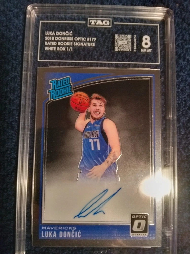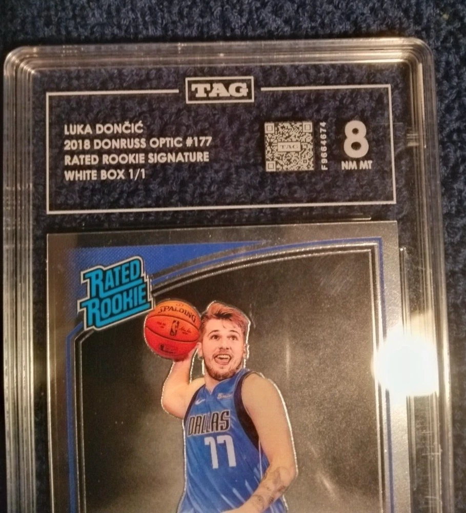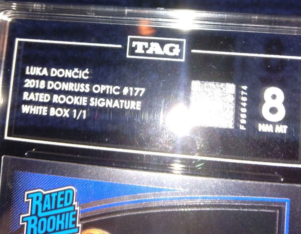 Elevate your collection with the 2018-19 Panini Optic White Box 1/1 Auto Luka Doncic #177 Rated Rookie Signature graded by TAG 8 card. This exclusive piece features the standout rookie, Luka Dončić, and is a must-have for fans and collectors alike. The card is part of the limited edition Rated Rookie Signatures 1/1 insert set, boasting an autograph by Dončić himself, ensuring its authenticity and value.Crafted by Panini, this card is one of a kind, serial numbered '1', and presented in a standard card size with a 20 Pt. thickness. It's a pristine original from the 2018 season, celebrating Luka's impact with the Dallas Mavericks and Los Angeles Lakers. A perfect addition to any NBA collection, this card comes with a certification number F9664674, verifying its grade and significance.
