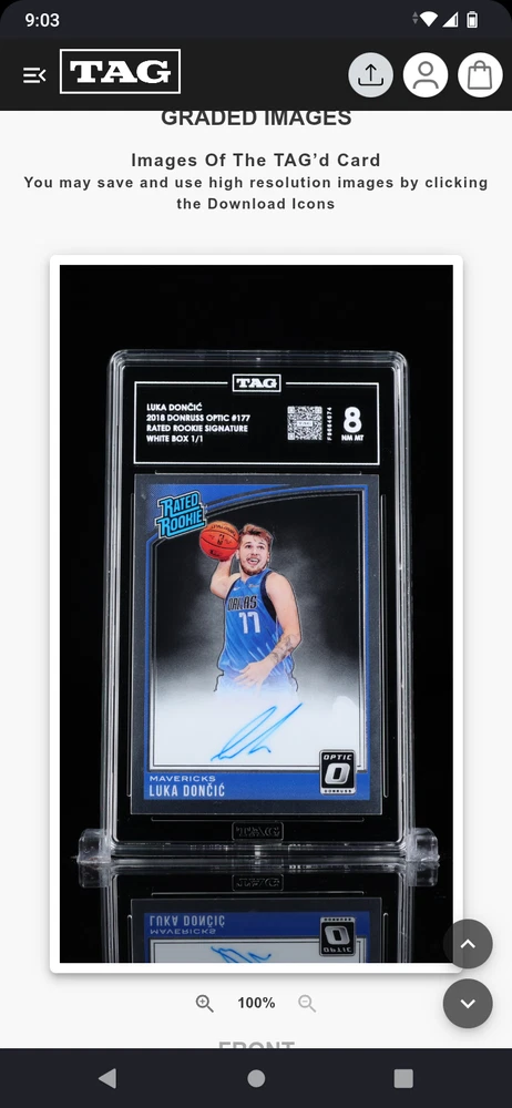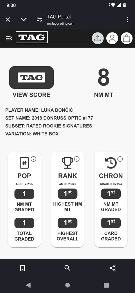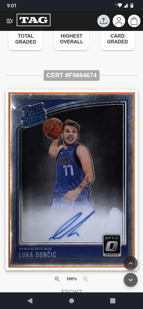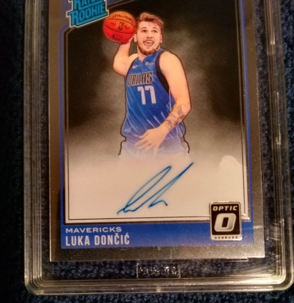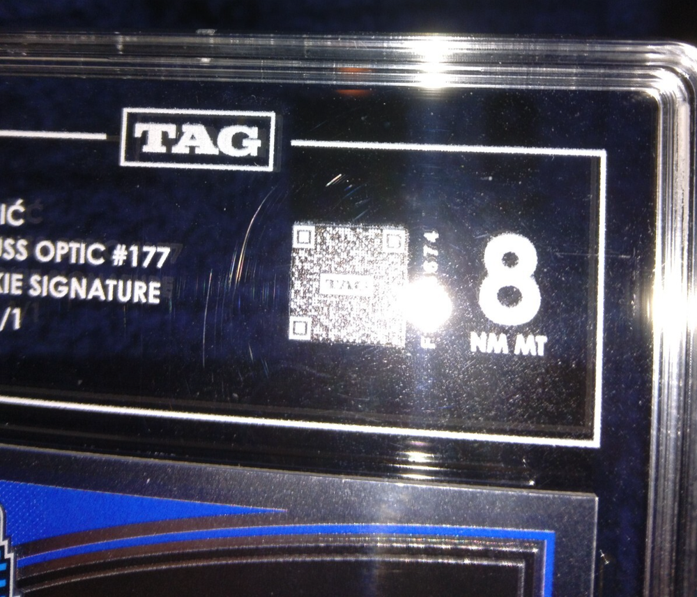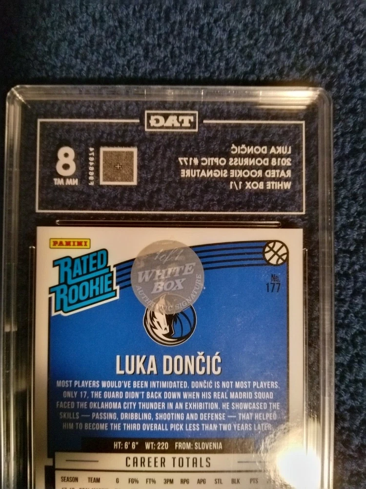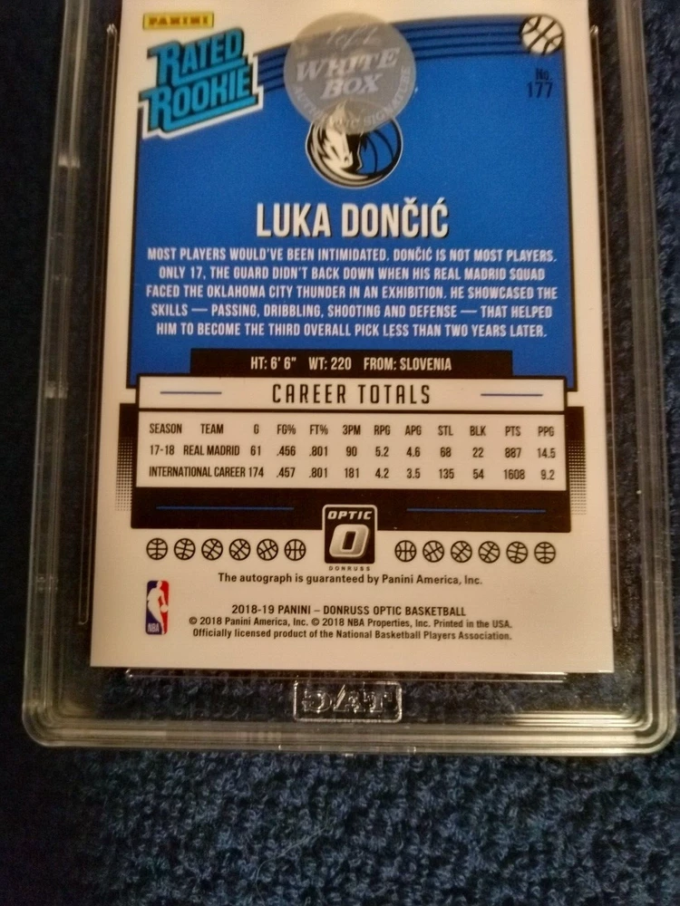 Elevate your collection with the 2018-19 Panini Optic White Box 1/1 Auto Luka Doncic #177 Rated Rookie Signature graded by TAG 8 card. This exclusive piece features the standout rookie, Luka Dončić, and is a must-have for fans and collectors alike. The card is part of the limited edition Rated Rookie Signatures 1/1 insert set, boasting an autograph by Dončić himself, ensuring its authenticity and value.Crafted by Panini, this card is one of a kind, serial numbered '1', and presented in a standard card size with a 20 Pt. thickness. It's a pristine original from the 2018 season, celebrating Luka's impact with the Dallas Mavericks and Los Angeles Lakers. A perfect addition to any NBA collection, this card comes with a certification number F9664674, verifying its grade and significance.