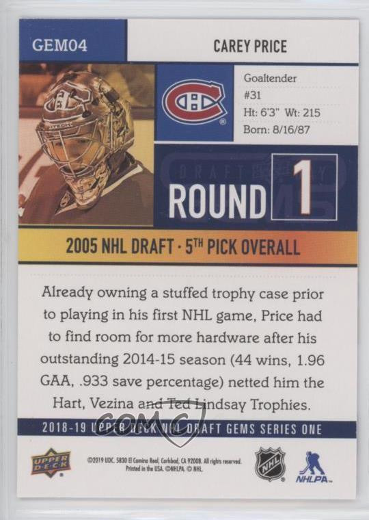 2018-19 Upper Deck - Draft Day Gems #GEM04 Carey Price - Ice Hockey Card - Featuring the Montreal Canadiens - Featuring Carey Price Search for more: 2018-19 Upper Deck Search for more: 2018-19 Upper Deck - Draft Day Gems View all of our Listings Auctions Buy It Now About Us Located in the beautiful Pacific Northwest, COMC (Check Out My Cards) is the world's largest consignment service for trading card singles. More than 10,000 people have used our consignment service to list over 50 million trading cards. Find out how we can help you consign your items on eBay by contacting us through eBay messaging. COMC -- "The Safe & Easy Way to Buy & Sell" Representative Image - Select Specific Item above to see image of actual item Representative Image - Select Specific Item above to see image of actual item Raw Condition for Modern Cards Unless otherwise noted, raw modern cards are listed in Near Mint-Mint condition or better. A NM-MT card appears to be Mint at first glance, but upon closer inspection, may exhibit some of the following: minor print defects (e.g. roller marks, print line, dimple), minor scratches, slight edge wear, and slight corner wear. Centering is clearly visible in the images provided and does not factor into our condition assessment. Raw Condition for Vintage Cards Unless otherwise noted, raw vintage cards are listed in Excellent condition or better. An EX card may exhibit some of the following: minor rounding of corners, surface wear, print defects, light scratches, and slight edge wear/chipping. Centering is clearly visible in the images provided and does not factor into our condition assessment. Domestic Shipping Combined shipping for multiple items is available. To receive combined shipping, please ensure all desired items are in your eBay shopping cart before proceeding to checkout. eBay limits orders to 40 items per order. We automatically combine multiple orders placed on the same day. If you place multiple orders on the same day, please contact us to request a refund of applicable shipping costs. Signature confirmation may be required on invoices over $400. All cards are protected and shipped securely. International Shipping COMC offers eBay's International Shipping (EIS) for international orders under $2,500* (see country exceptions below). All duties and import fees are paid at checkout; in the rare event that there are additional import fees upon delivery, these are borne by the buyer. EIS packages route through a shipping hub in Erlanger, KY before shipping to their final destination. Please note that EIS does not allow for combined shipments. The shipping rates are determined by eBay and cannot be adjusted. *Maximum sale price exceptions: Colombia, Kuwait ($2,000); Taiwan ($1,539); Chile, Costa Rica, Guatemala, Honduras, Trinidad and Tobago ($1,000); Antigua and Barbuda, Aruba, Belize, Dominica, Grenada, Philippines, Saint Kitts and Nevis, Saint Lucia, Montserrat, Turks and Caicos Islands ($500); Dominican Republic, El Salvador ($200). Please request a shipping quote through eBay messaging for orders that exceed the maximum sale price supported by eBay's International Shipping. You will be responsible for all duties and import fees for international orders shipped outside the EIS. All cards are protected and shipped securely. Payment COMC does not accept offers on our cards through our eBay storefront. COMC utilizes eBay’s managed payments system. If you are experiencing difficulties making a payment, please contact eBay for assistance. Return Policy Returns are only accepted on the rare occasion the item is not as described. If you are making a return, please initiate the return process through eBay so a mailing label can be provided for you. Prior to listing, our expert team carefully assessed this item to represent it accurately. Please review the description and high-definition images prior to purchasing to ensure this item meets your satisfaction. We welcome you to contact us if you have further questions about this item. Trust and Integrity COMC carefully assesses each item consigned to us to prevent fraudulent items from entering the marketplace. If you believe an item offered on COMC may be fraudulent, please contact us with details so we can investigate the issue. Items we determine are outside our supported items policy may be removed. Last Modified: 3/30/2025 5:48:26 PM PDT