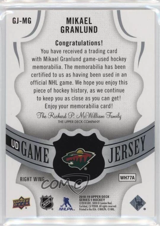 2018-19 Upper Deck - UD Game Jersey #GJ-MG Mikael Granlund - Ice Hockey Card - Featuring the Minnesota Wild - Featuring Mikael Granlund Search for more: 2018-19 Upper Deck Search for more: 2018-19 Upper Deck - UD Game Jersey View all of our Listings Auctions Buy It Now About Us Located in the beautiful Pacific Northwest, COMC (Check Out My Cards) is the world's largest consignment service for trading card singles. More than 10,000 people have used our consignment service to list over 50 million trading cards. We currently house 20 million cards, each listed for sale with front and back images of the actual card. Find out how we can help you consign your items on eBay by contacting us through eBay messaging. COMC -- "The Safe & Easy Way to Buy & Sell" Representative Image - Select Specific Item above to see image of actual item Representative Image - Select Specific Item above to see image of actual item Raw Condition for Modern Cards Unless otherwise noted, raw modern cards are listed in Near Mint-Mint condition or better. A NM-MT card appears to be Mint at first glance, but upon closer inspection, may exhibit some of the following: minor print defects (e.g. roller marks, print line, dimple), minor scratches, slight edge wear, and slight corner wear. Centering is clearly visible in the images provided and does not factor into our condition assessment. Raw Condition for Vintage Cards Unless otherwise noted, raw vintage cards are listed in Excellent condition or better. An EX card may exhibit some of the following: minor rounding of corners, surface wear, print defects, light scratches, and slight edge wear/chipping. Centering is clearly visible in the images provided and does not factor into our condition assessment. Domestic Shipping Combined shipping for multiple items is available. To receive combined shipping, please ensure all desired items are in your eBay shopping cart before proceeding to checkout. eBay limits orders to 40 items per order. We automatically combine multiple orders placed on the same day. If you place multiple orders on the same day, please contact us to request a refund of applicable shipping costs. Signature confirmation may be required on invoices over $400. Raw cards are shipped in toploaders. International Shipping COMC offers eBay's International Shipping (EIS) for international orders under $2,500* (see country exceptions below). All duties and import fees are paid at checkout; in the rare event that there are additional import fees upon delivery, these are borne by the buyer. EIS packages route through a shipping hub in Erlanger, KY before shipping to their final destination. Please note that EIS does not allow for combined shipments. The shipping rates are determined by eBay and cannot be adjusted. *Maximum sale price exceptions: Colombia, Kuwait ($2,000); Taiwan ($1,539); Chile, Costa Rica, Guatemala, Honduras, Trinidad and Tobago ($1,000); Antigua and Barbuda, Aruba, Belize, Dominica, Grenada, Philippines, Saint Kitts and Nevis, Saint Lucia, Montserrat, Turks and Caicos Islands ($500); Dominican Republic, El Salvador ($200). Please request a shipping quote through eBay messaging for orders that exceed the maximum sale price supported by eBay's International Shipping. You will be responsible for all duties and import fees for international orders shipped outside the EIS. Raw cards are shipped in toploaders. Payment COMC does not accept offers on our cards through our eBay storefront. COMC utilizes eBay’s managed payments system. If you are experiencing difficulties making a payment, please contact eBay for assistance. Return Policy Returns are only accepted on the rare occasion the item is not as described. If you are making a return, please initiate the return process through eBay so a mailing label can be provided for you. Prior to listing, our expert team carefully assessed this item to represent it accurately. Please review the description and high-definition images prior to purchasing to ensure this item meets your satisfaction. We welcome you to contact us if you have further questions about this item. Trust and Integrity COMC carefully assesses each item consigned to us to prevent fraudulent items from entering the marketplace. If you believe an item offered on COMC may be fraudulent, please contact us with details so we can investigate the issue. Items we determine are outside our supported items policy may be removed. Last Modified: 12/15/2024 4:10:13 AM PDT