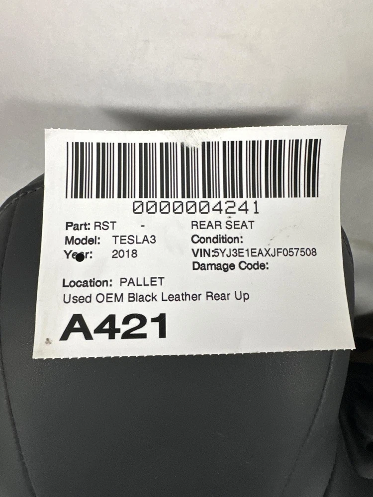 HK Auto Salvage HK Auto Salvage Montebello, CA Business Hours (PST/PDT) Mon - Fri 8am - 5pm Saturday 8am - 2pm Closed Sat & Sun Rear Seat Year: 18 Model: TESLA MODEL 3 Side: Type: Used Category: Condition: VIN: 5YJ3E1EAXJF057508 Vehicle Stock #: A421 Part Stock #: 0000004241 Vehicle Info: WHITE EXT,BLACK INT Additional notes: Used Oem Black Leather Rear Upper Backrest Cushion Double See Pictures To Verify Interchange: Also fits: Search for more parts from this donor vehicle Search for more parts for TESLA MODEL 3 Airbag Notification If the item above is an airbag, I certify this airbag is not subject to recall and will be shipped in accordance with hazmat shipping requirements . Payment We accept credit cards through eBay Managed Payments only Sales tax collected by eBay where applicable COD available for orders placed for delivery to local businesses; please contact us prior to purchase to arrange Pay on pickup available for orders placed for local pickup Shipping We ship by FedEx, UPS, and USPS. Most items ship within 24 hours of payment; items paid for on the weekend or holidays ship on the following business day. Any free shipping we offer is for the continental United States only. If you are from Hawaii, Alaska, or a Territory of the United States, please request a shipping total before bidding and we will do our best to keep the cost low. Local delivery and local pickup options are also available. Warranty & Returns 30-day standard warranty on all general parts 90-day standard warranty on engines and transmissions Please verify fitment independently prior to purchase, as the information in the "compatibility" section above is generated by eBay Motors and not from us. If you have questions or concerns about fitment, please contact us prior to purchase. Contact Us If you have any questions regarding an eBay item, please CONTACT US via eBay messaging before you make the purchase. Please verify fitment independently prior to purchase, as the information in the "compatibility" section above is generated by eBay Motors and not from us. If you have questions or concerns about fitment, please contact us prior to purchase. After you have received your product in satisfactory condition, please leave us positive feedback. If there is a problem with your purchase, do not leave neutral or negative feedback: CONTACT US so that we can help you to resolve your issue to your satisfaction. Powered by Checkmate