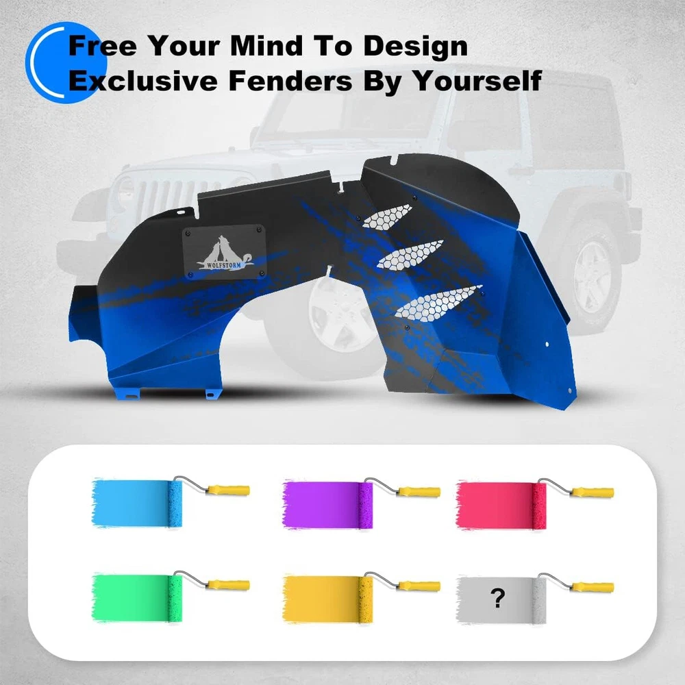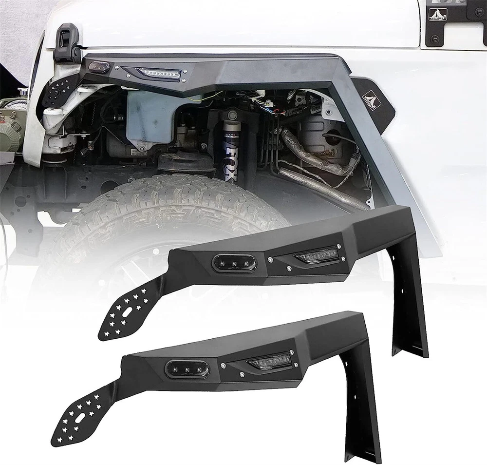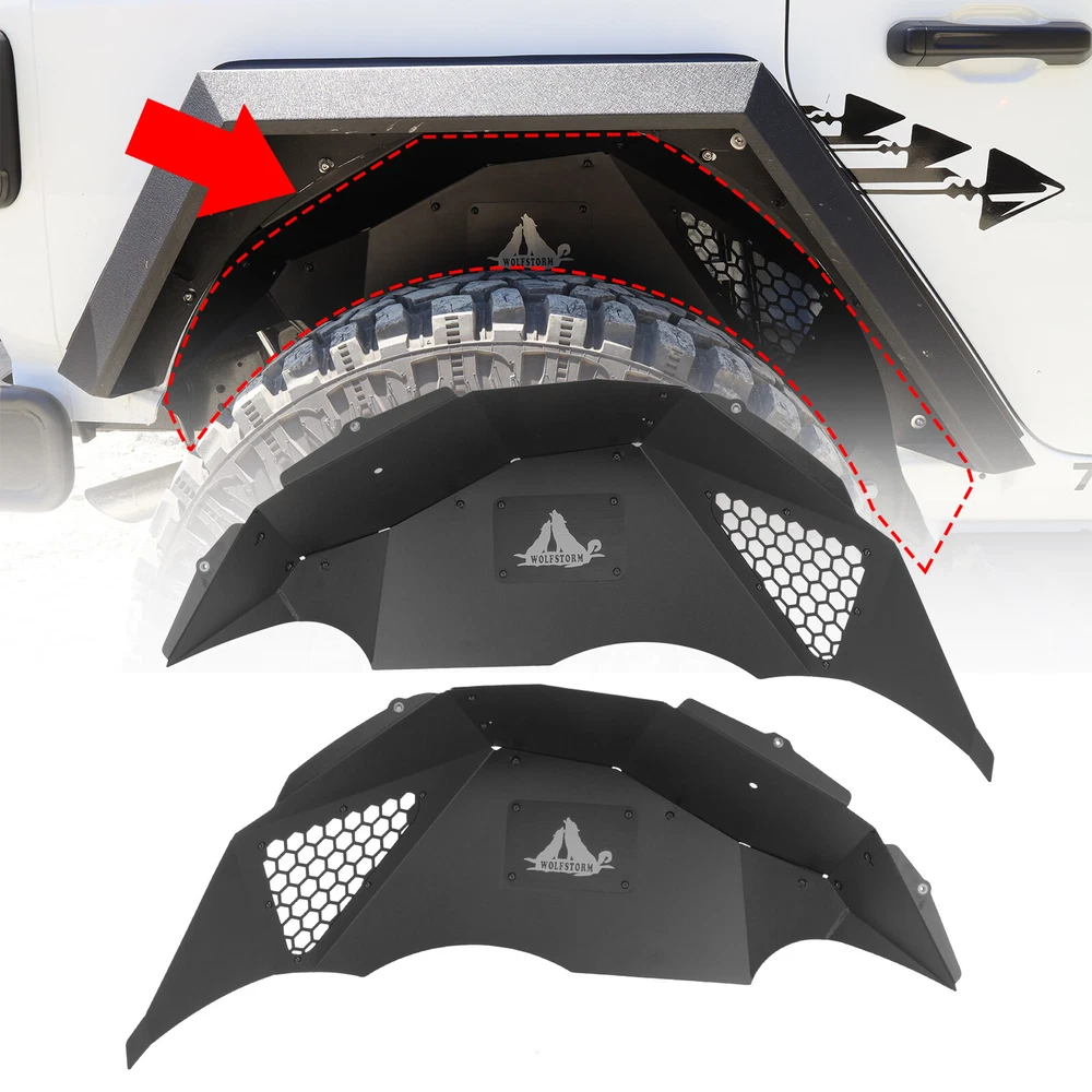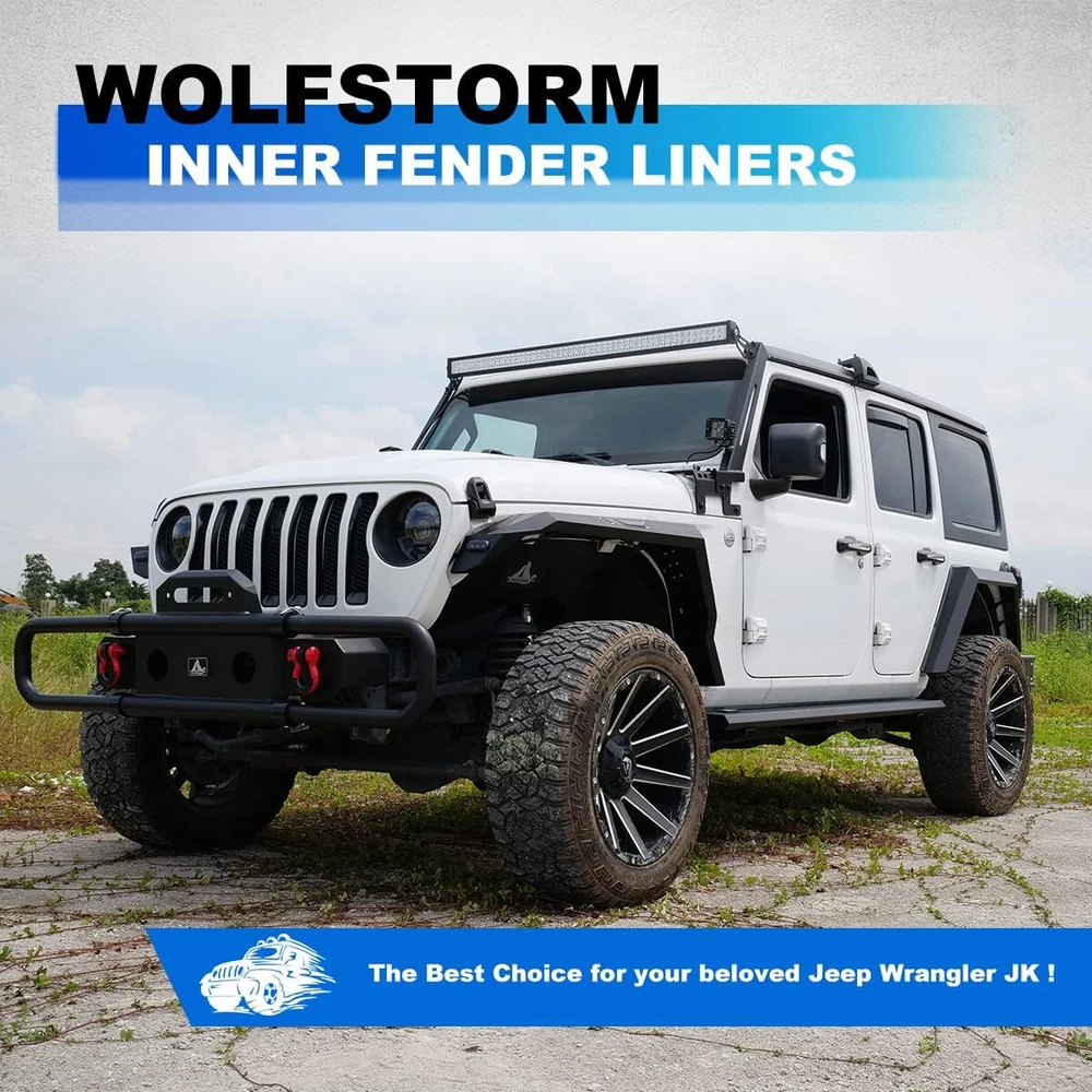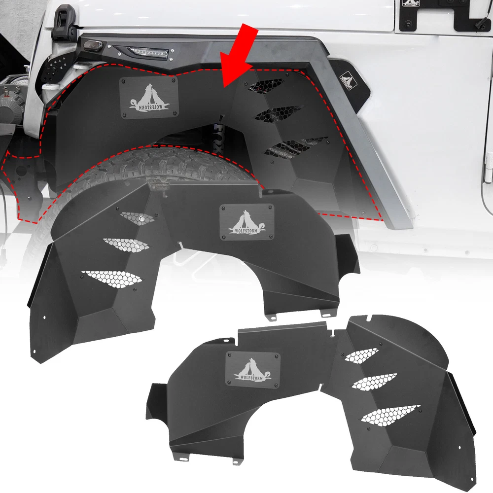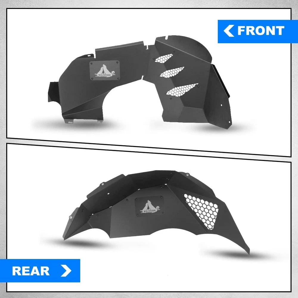 Inner Fenders Liners Features 1 Pair of Front & Rear Inner Fenders - A set of front & rear inner fenders for your Jeep Wrangler JL 2DR, 4DR and Gladiator JT. Stylish Vent Design - Allows for heat dissipation and a peek inside the inner workings of your vehicle. Easy Access - Reach the Jeep's shocks with ease, and totally protect your vehicle from mud and debris getting in the engine bay. Heavy Duty Build - Cold rolled steel with a textured black powder coat for corrosion protection and durability. 100% Brand New in the box with manufacturer packaging, never been opened or installed before. Designed in USA Fitment Compatible for 2018-2021 Jeep Wrangler JL 2DR, 4DR & Gladiator JT Package Includes 2 * Front Inner Fenders Liners 2 * Rear Inner Fenders Liners 1 * set of Mounting Accessories After-sales Service 1 year manufacturer warranty. 30-Day return policy. Fender Flares Features: Multifunctional design - Equipped with LED sequential turn signal lights and LED side marker lights (LED lights with DOT & SAE compliance for street use) 1 pair front and rear - a full set of fender flares for your Jeep Wrangler JL. Heavy duty build - Heavy Duty steel construction with black powder coat finish process. Easy installation - package includes installation manual for your reference, direct bolt-on installation. 1 year manufacturer warranty. 30-Day return policy. Specification: Material: Textured Black Powder Coated Steel Features: Mounting Hardware Included Product Weight: 43.43 lbs Product Dimensions: Front : 43.99 x 21.57 Inches; Rear : 46.49 x 18.23 Inches Fitment: 2018 2019 2020 2021 2022 2023 Jeep Wrangler JL 2 Door & 4 Door Package Included: 1* Pair of Front Fender Flares 1* Pair of Rear Fender Flares 1* Set of Mounting Accessories 1* Installation Manual