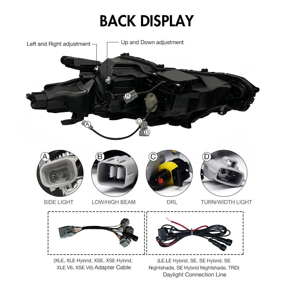 sunny-light new item Full LED Headlights Fit for Jetta MK6 2012-2018 Head Front Lamps Assembly Pair BUY NOW Pair Headlights Assembly w/ LED DRL For 2014-2021 Toyota Tundra Front Headlamps BUY NOW Pair Full LED Headlights For Toyota Tundra 2007-2013 Head Front Lamps Assembly BUY NOW RGB LED Headlights For Honda Civic 2016-2021 RGB DRL Sequential Turn Assembly BUY NOW Pair For 2022 2023 2024 Honda Civic 11th Gen Headlights LED Head Lamp Assembly BUY NOW LED Headlights For Toyota Camry 2018-2022 DRL 8-Lens Red Demon Eye Assembly BUY NOW RGB LED Tail Lights & Tailgate Light for Toyota Corolla 2020-2024 RGB Assembly BUY NOW RGB Full LED Tail Lights For 2015-2023 Ford Mustang w/ 11 Modes Sequential lamp BUY NOW Pair RGB LED Tail Lights for Honda Accord 2018-2022 RGB DRL Taillight Assembly BUY NOW LED Rear Tail Lights Assembly for Toyota US Corolla Hatchback 2020-2024 RH&LH BUY NOW RGB Color LED Headlights Assembly For Toyota Camry 2018-2024 Front Head Lamps BUY NOW Smoke LED DRL Projector Headlights For 2008-2015 Infiniti G37/Q60 Coupe 2-Door BUY NOW LED Headlights For BMW E90 E91 328 335 2005-2012 Sequential Turn Signal Assembly BUY NOW Pair Headlight For 2022-2025 11th Gen Honda Civic LED Sequential Turn Signal DRL BUY NOW LED Headlights For Toyota Camry SE LE XSE XLE TRD 2018-2023 Headlights Assembly BUY NOW Pair Full LED Headlights For VW MK7 Golf 2013-2018 Head Front Lamps Sequential BUY NOW Pair LED Headlights Red Demon Eye For 2022-2025 Honda Civic w/Startup Animation BUY NOW RGB LED Headlights For BMW 3-Series E90 E91 2005-2012 Sequential Front Lamps BUY NOW LED Headlights For Toyota Camry 2018-2024 with Red Demon Eyes Head Lamp Assembly Fitment: For Toyota Camry 2018 2019 2020 2021 2022 2023 2024 Package Includes: 1 Pair (Driver Side + Passenger Side) Headlights Assembly Set (Including Some Installation Accessories) Specification : Brand :TT-ABC Product Condition: 100% Brand New Type: Led Headlights Assembly A few second of Start up Animation Sequential Turn Signal Full LED, No need to purchase additional light bulbs Functions: Devil Eye +DRL +High Beam+Low Beam lights+Turn Signal+ Animation Housing Color: Black Lens Color:Clear Operating Voltage: 12V-14V Color Temperature: 5500K-6500K Power: 45W Low beam - 5500K, 65W High beam - 6500K Material:High Quality ABS Plastic+PC+PMMA Waterproof Rate:IP68 Warranty:1 year Recommend professional installation technicians Features:DOT-Certifed, Durable, Easy lnstalation, High Quality, OE-Certified, AE-Cerified, Sealed Assembly, Waterproof, ISO-Certifed, Dustproof And Shurdy Note: 1.Please check the brand, the model, the year of your car's and original lights is same as this light shape and plug~ if you can't confirm it, you can send us an pic about your car or tell us your car's brand, model, year, we will help you confirm if suitable for ur car~ 2.Please check shipping address before payment, we only ship to the address you left on ebay~ can't change your shipping address after placing an order. 3.Please Using our wiring harness / connector for installation ~ will avoid cutting or modifying any wires. welcome to contact us anytime if you have any installation issues 4.we accept return for refund within 30 days, if you return this item back, We will open the box and inspect this returned item to confirm the returned item is the correct item, and then, will arrange to full refund you and send you an e-mail to inform~ 5.If any problem with the product, please feel free to contact us, we can help you solve it or response you within 24 hours! but on weekend and holidays, we response will be within 48 hours~ sorry for any inconvenient About us Payment Shipping Returns Contact us Feedback My store specializes in selling various car modification and customization products, including headlights, high beams, low beams, fog lights, contour lights, turn signals, brake lights, reverse lights, and interior lighting. At the same time, we have our own production factory and cooperate with hundreds of component factories, committed to providing customers with high-quality products, the most favorable prices, and a professional after-sales customer service team. Our goal is to meet the needs of our customers and provide them with an excellent shopping experience. 1.We can accept payment method is PayPal, Google Pay, Visa, Master Card, Amex and Discover and other payment way. 2.Immediate payment needs to be processed for items with Add to Cart option so that any promotional discounts can be applied to your order immediately. 3.Please confirm if the address and postal code are correct before placing an order! Convenient and fast shipping. 1.The package is Shipping from the US Stock by USPS,FedEx or UPS . 2.Shipment will be made within 1 business day after payment, and delivery will take 1-5 business days (excluding packages with a unit price below $50) 3.Please offer us your telephone number and correct zip code,or your order will be delayed since the courier will need it for the delivery.(not ship to Alaska, Hawaii and Puerto Rico). 4.Shipping Fee is include packing & handling charges. 5.International Customers:Import duties, taxes, value added tax and Other charges are Not Includes in the item price or shipping charges. These charges are the buyer’s responsibility and vary by country/location.These charges are not to be confused for additional shipping charges. 6.Please check with your country’s customs office to determine what these additional costs will be prior to bidding/buying. These charges are normally collected by the delivering freight (shipping) company or when you pick the item up. These charges are not to be confused for additional shipping charges. There are some tips for you: 1. If There are any problems with the product, please contact with us before leaving neutral and negative reviews feedback ,give me a Chance to make it right 2. If you are in our exclusion countries. Please write to us for shipping .If When the goods arrive, please check th
