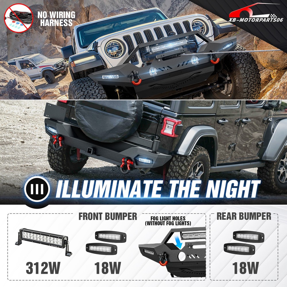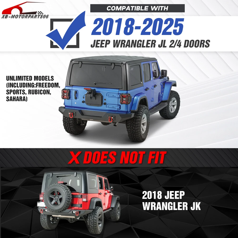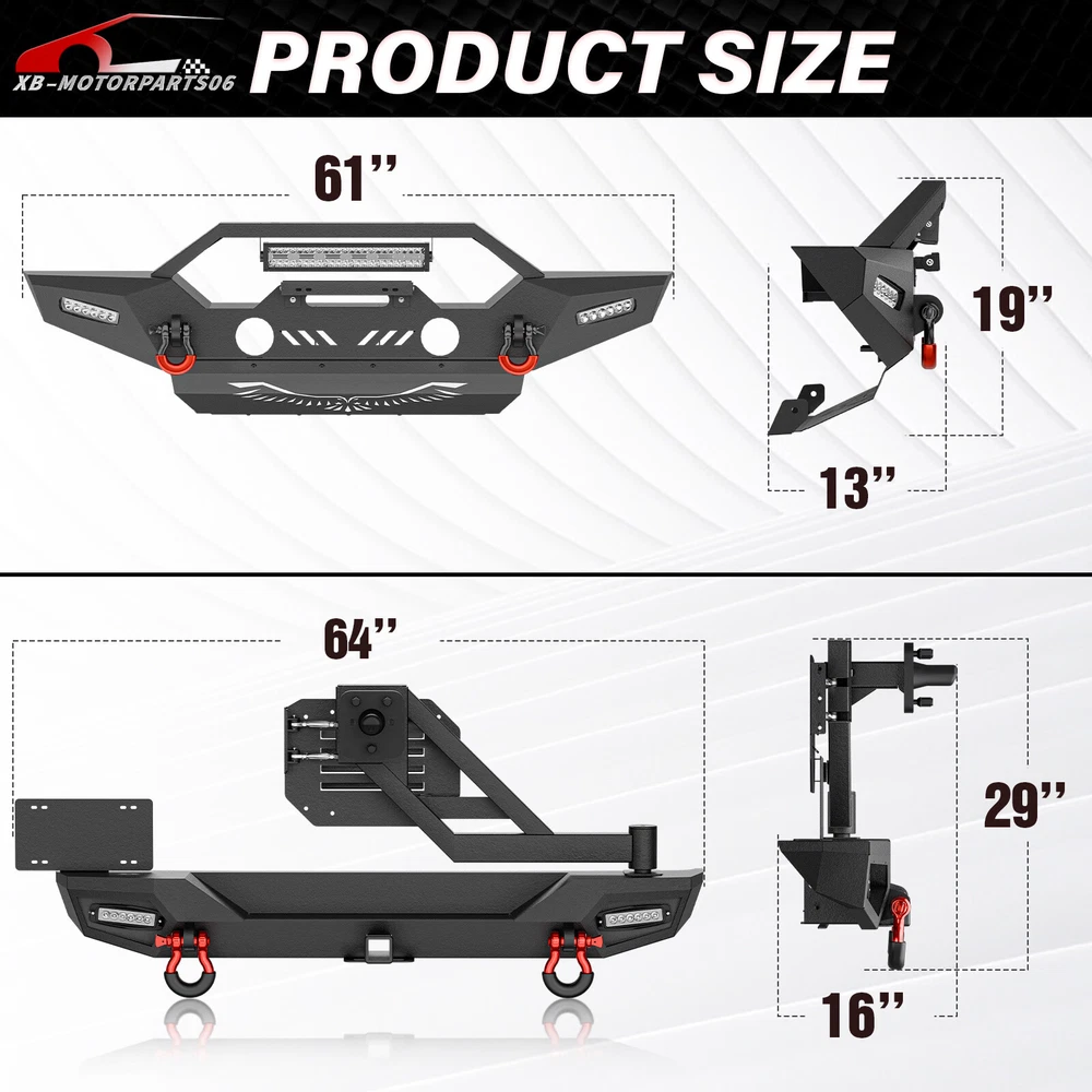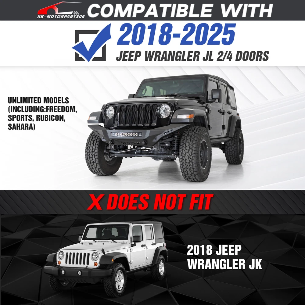 Front Or Rear Bumper W/ License Plate Bracket For 2018-2025 Jeep Wrangler JL JLU Please pay attention to the product options you select: If you choose Front & Rear Bumper,You can get 1 × Front Bumper, 1 × Rear Bumper and Mounting Hardware; If you choose Only Front Bumper,You can get 1 × Front Bumper and Mounting Hardware; If you choose Only Rear Bumper,You can get 1 × Rear Bumper and Mounting Hardware; Suitable Models : Compatible with 2018-2025 Jeep Wrangler JL JLU Unlimited 2/4 Doors( Includes 4XE models ) Package Includes : ① Front & Rear Bumper option : 1 x Front Bumper, 1 x Rear Bumper, 5 x LED Lights, 1 x Winch Plate , 4 x D-rings, 2 x License Plate Bracket, 1 x Hitch Receiver , 1 x Spare Tire Carrier, Skid Plate, 2 x manual, screw fittings ② Fro nt Bumper option : 1 x Front Bumper, 1 x License Plate Bracket, 1 x Winch Plate , 3 x LED Lights, 2 x D-rings, Skid Plate, 1 x manual, screw fittings ③ Rear Bumper option : 1 x Rear Bumper, 1 x Hitch Receiver, 2 x D-rings, 2 x LED Lights, 1 x Spare Tire Carrier, 1 x License Plate Bracket, 1 x manual, screw fittings Product Information : Package Dimensions : 65.35"D x 21.65"W x 14.17"H Installation mode: Bolt-On With Sensor Holes: No Steel thickness: 3mm Placement on Vehicle: Front/Rear Item Weight: Front Bumper: 68 Pounds; Rear Bumper: 111 Pounds Material: Carbon Steel Color: Black (hand measurements may have an error of 2-3 mm/0.078-0.118 in) Feature : Front bumper : ① The front bumper comes with a rugged style skid plate, a 12,000 lbs winch plate, a license plate bracket, two 4.75-ton D-rings (rated at 9500 lbs), pre-drilled holes for OE Fog Lights, a 312W LED spotlight and two 18W LED spotlights for strong illumination; ② The package includes all necessary mounting hardware and detailed installation instructions. The bumper with skid plate can be easily installed using bolt-on installation, without the need for drilling; ③ Strong steel front bumper and skid plate with two-stage black powder coating resists rust, ensuring durability and lasting appeal, even with minor damage; ④ Powder Coated, Durability, Waterproof; Rear Bumper : ① The bumper is equipped with an external swing-out spare tire carrier that can hold tires as large as 37 inches. The updated connectors have been redesigned to provide a secure locking mechanism, eradicating worries about the tire carrier becoming dislodged during off-road excursions. Additionally, the spare tire carrier features a Rear View Camera Slot, allowing for easy integration of a rearview camera to enhance visibility and safety while maneuvering; ② Our bumper boasts sturdy dual D-ring shackle mounts, rated at 9500lbs., and is equipped with 2X Upgraded LED Lights, a license plate bracket, and a 2" standard receiver hitch, perfect for off-road adventures; ③ Our rear bumper is constructed from high-strength steel for exceptional durability. With a two-stage textured black powder coating finish, it not only looks stylish but also provides added protection; ④ Durability, Waterproof, Rust-proof; Warranty Period :2 year Standard Shipping (FedEx Ground or FedEx Home Delivery) Will usually ship within 3 business days of receiving cleared payment Please pay attention to the product options you select: If you choose Front & Rear Bumper,You can get 1 × Front Bumper, 1 × Rear Bumper and Mounting Hardware; If you choose Only Front Bumper,You can get 1 × Front Bumper and Mounting Hardware; If you choose Only Rear Bumper,You can get 1 × Rear Bumper and Mounting Hardware; Suitable Models : Compatible with 2018-2025 Jeep Wrangler JL JLU Unlimited 2/4 Doors( Includes 4XE models ) Package Includes : ① Front & Rear Bumper option : 1 x Front Bumper, 1 x Rear Bumper, 5 x LED Lights, 1 x Winch Plate , 4 x D-rings, 2 x License Plate Bracket, 1 x Hitch Receiver , 1 x Spare Tire Carrier, Skid Plate, 2 x manual, screw fittings ② Fro nt Bumper option : 1 x Front Bumper, 1 x License Plate Bracket, 1 x Winch Plate , 3 x LED Lights, 2 x D-rings, Skid Plate, 1 x manual, screw fittings ③ Rear Bumper option : 1 x Rear Bumper, 1 x Hitch Receiver, 2 x D-rings, 2 x LED Lights, 1 x Spare Tire Carrier, 1 x License Plate Bracket, 1 x manual, screw fittings Product Information : Package Dimensions : 65.35"D x 21.65"W x 14.17"H Installation mode: Bolt-On With Sensor Holes: No Steel thickness: 3mm Placement on Vehicle: Front/Rear Item Weight: Front Bumper: 68 Pounds; Rear Bumper: 111 Pounds Material: Carbon Steel Color: Black (hand measurements may have an error of 2-3 mm/0.078-0.118 in) Feature : Front bumper : ① The front bumper comes with a rugged style skid plate, a 12,000 lbs winch plate, a license plate bracket, two 4.75-ton D-rings (rated at 9500 lbs), pre-drilled holes for OE Fog Lights, a 312W LED spotlight and two 18W LED spotlights for strong illumination; ② The package includes all necessary mounting hardware and detailed installation instructions. The bumper with skid plate can be easily installed using bolt-on installation, without the need for drilling; ③ Strong steel front bumper and skid plate with two-stage black powder coating resists rust, ensuring durability and lasting appeal, even with minor damage; ④ Powder Coated, Durability, Waterproof; Rear Bumper : ① The bumper is equipped with an external swing-out spare tire carrier that can hold tires as large as 37 inches. The updated connectors have been redesigned to provide a secure locking mechanism, eradicating worries about the tire carrier becoming dislodged during off-road excursions. Additionally, the spare tire carrier features a Rear View Camera Slot, allowing for easy integration of a rearview camera to enhance visibility and safety while maneuvering; ② Our bumper boasts sturdy dual D-ring shackle mounts, rated at 9500lbs., and is equipped with 2X Upgraded LED Lights, a license plate bracket, and a 2" standard receiver hitch, perfect for off-road adventures; ③ Our rear bumper is constructed from high-strength steel for 