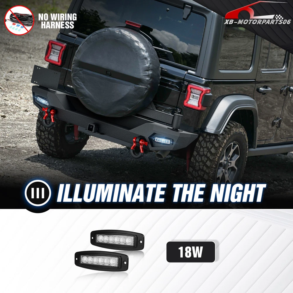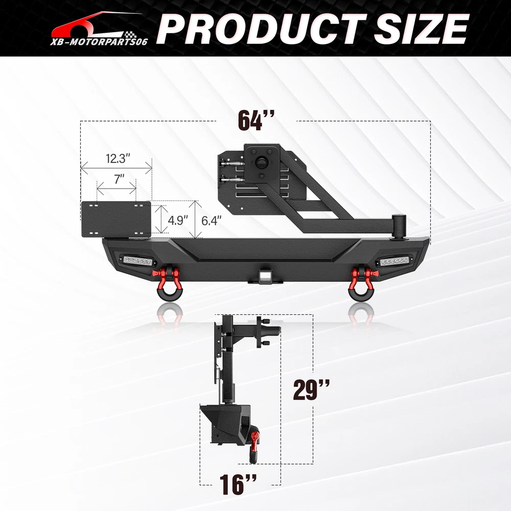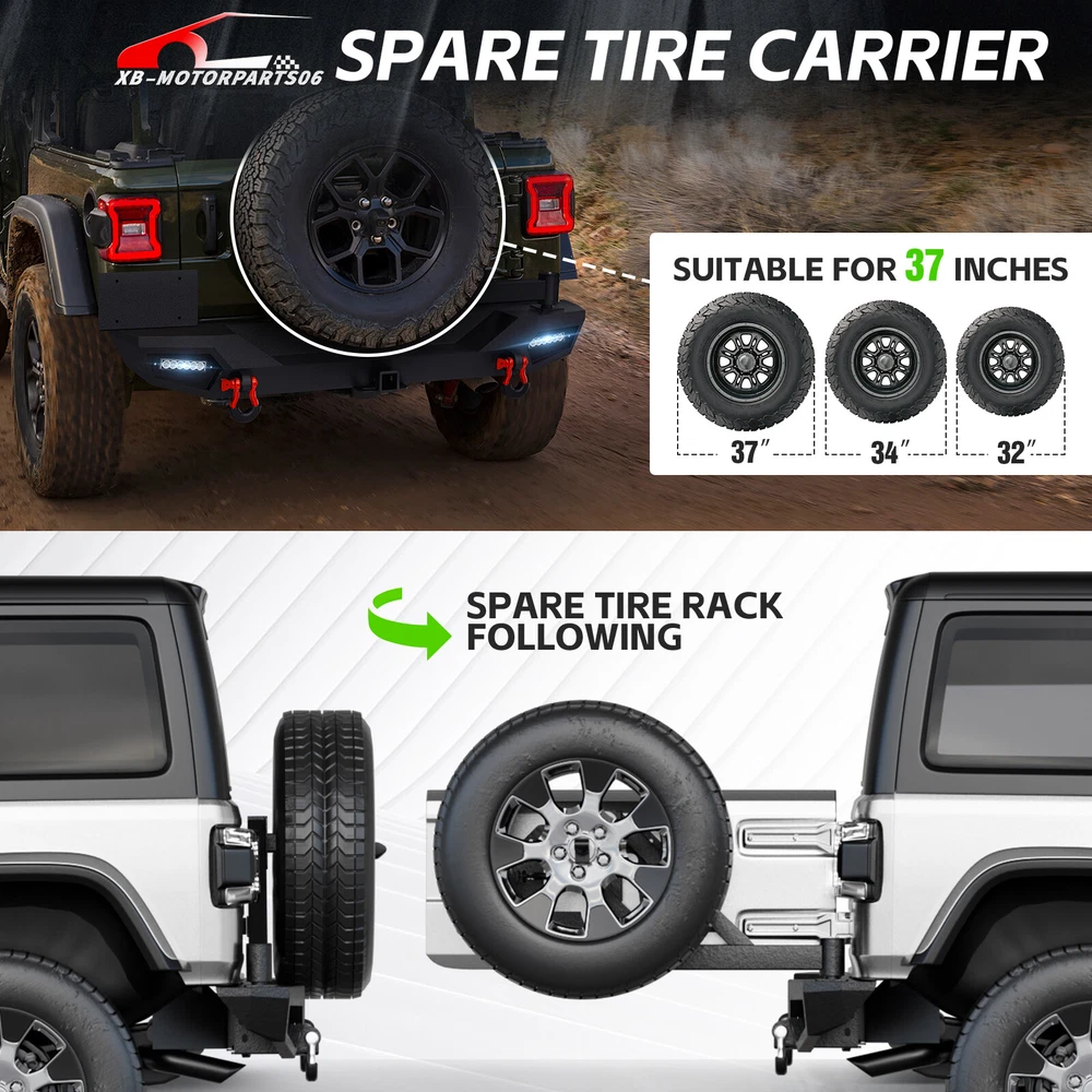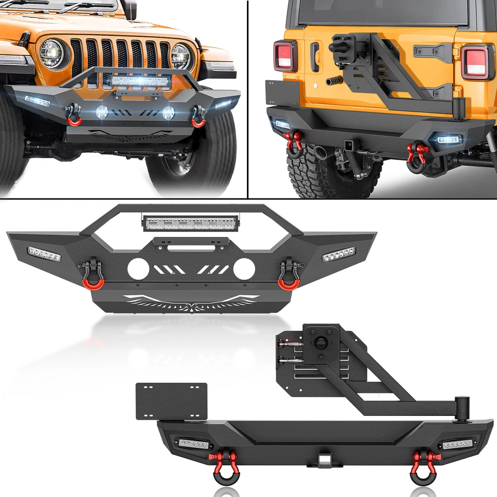 Front Or Rear Bumper W/ License Plate Bracket For 2018-2025 Jeep Wrangler JL JLU Please pay attention to the product options you select: If you choose Front & Rear Bumper,You can get 1 × Front Bumper, 1 × Rear Bumper and Mounting Hardware; If you choose Only Front Bumper,You can get 1 × Front Bumper and Mounting Hardware; If you choose Only Rear Bumper,You can get 1 × Rear Bumper and Mounting Hardware; Suitable Models : Compatible with 2018-2025 Jeep Wrangler JL JLU Unlimited 2/4 Doors( Includes 4XE models ) Package Includes : ① Front & Rear Bumper option : 1 x Front Bumper, 1 x Rear Bumper, 5 x LED Lights, 1 x Winch Plate , 4 x D-rings, 2 x License Plate Bracket, 1 x Hitch Receiver , 1 x Spare Tire Carrier, Skid Plate, 2 x manual, screw fittings ② Fro nt Bumper option : 1 x Front Bumper, 1 x License Plate Bracket, 1 x Winch Plate , 3 x LED Lights, 2 x D-rings, Skid Plate, 1 x manual, screw fittings ③ Rear Bumper option : 1 x Rear Bumper, 1 x Hitch Receiver, 2 x D-rings, 2 x LED Lights, 1 x Spare Tire Carrier, 1 x License Plate Bracket, 1 x manual, screw fittings Product Information : Package Dimensions : 65.35"D x 21.65"W x 14.17"H Installation mode: Bolt-On With Sensor Holes: No Steel thickness: 3mm Placement on Vehicle: Front/Rear Item Weight: Front Bumper: 68 Pounds; Rear Bumper: 111 Pounds Material: Carbon Steel Color: Black (hand measurements may have an error of 2-3 mm/0.078-0.118 in) Feature : Front bumper : ① The front bumper comes with a rugged style skid plate, a 12,000 lbs winch plate, a license plate bracket, two 4.75-ton D-rings (rated at 9500 lbs), pre-drilled holes for OE Fog Lights, a 312W LED spotlight and two 18W LED spotlights for strong illumination; ② The package includes all necessary mounting hardware and detailed installation instructions. The bumper with skid plate can be easily installed using bolt-on installation, without the need for drilling; ③ Strong steel front bumper and skid plate with two-stage black powder coating resists rust, ensuring durability and lasting appeal, even with minor damage; ④ Powder Coated, Durability, Waterproof; Rear Bumper : ① The bumper is equipped with an external swing-out spare tire carrier that can hold tires as large as 37 inches. The updated connectors have been redesigned to provide a secure locking mechanism, eradicating worries about the tire carrier becoming dislodged during off-road excursions. Additionally, the spare tire carrier features a Rear View Camera Slot, allowing for easy integration of a rearview camera to enhance visibility and safety while maneuvering; ② Our bumper boasts sturdy dual D-ring shackle mounts, rated at 9500lbs., and is equipped with 2X Upgraded LED Lights, a license plate bracket, and a 2" standard receiver hitch, perfect for off-road adventures; ③ Our rear bumper is constructed from high-strength steel for exceptional durability. With a two-stage textured black powder coating finish, it not only looks stylish but also provides added protection; ④ Durability, Waterproof, Rust-proof; Warranty Period :2 year Standard Shipping (FedEx Ground or FedEx Home Delivery) Will usually ship within 3 business days of receiving cleared payment Please pay attention to the product options you select: If you choose Front & Rear Bumper,You can get 1 × Front Bumper, 1 × Rear Bumper and Mounting Hardware; If you choose Only Front Bumper,You can get 1 × Front Bumper and Mounting Hardware; If you choose Only Rear Bumper,You can get 1 × Rear Bumper and Mounting Hardware; Suitable Models : Compatible with 2018-2025 Jeep Wrangler JL JLU Unlimited 2/4 Doors( Includes 4XE models ) Package Includes : ① Front & Rear Bumper option : 1 x Front Bumper, 1 x Rear Bumper, 5 x LED Lights, 1 x Winch Plate , 4 x D-rings, 2 x License Plate Bracket, 1 x Hitch Receiver , 1 x Spare Tire Carrier, Skid Plate, 2 x manual, screw fittings ② Fro nt Bumper option : 1 x Front Bumper, 1 x License Plate Bracket, 1 x Winch Plate , 3 x LED Lights, 2 x D-rings, Skid Plate, 1 x manual, screw fittings ③ Rear Bumper option : 1 x Rear Bumper, 1 x Hitch Receiver, 2 x D-rings, 2 x LED Lights, 1 x Spare Tire Carrier, 1 x License Plate Bracket, 1 x manual, screw fittings Product Information : Package Dimensions : 65.35"D x 21.65"W x 14.17"H Installation mode: Bolt-On With Sensor Holes: No Steel thickness: 3mm Placement on Vehicle: Front/Rear Item Weight: Front Bumper: 68 Pounds; Rear Bumper: 111 Pounds Material: Carbon Steel Color: Black (hand measurements may have an error of 2-3 mm/0.078-0.118 in) Feature : Front bumper : ① The front bumper comes with a rugged style skid plate, a 12,000 lbs winch plate, a license plate bracket, two 4.75-ton D-rings (rated at 9500 lbs), pre-drilled holes for OE Fog Lights, a 312W LED spotlight and two 18W LED spotlights for strong illumination; ② The package includes all necessary mounting hardware and detailed installation instructions. The bumper with skid plate can be easily installed using bolt-on installation, without the need for drilling; ③ Strong steel front bumper and skid plate with two-stage black powder coating resists rust, ensuring durability and lasting appeal, even with minor damage; ④ Powder Coated, Durability, Waterproof; Rear Bumper : ① The bumper is equipped with an external swing-out spare tire carrier that can hold tires as large as 37 inches. The updated connectors have been redesigned to provide a secure locking mechanism, eradicating worries about the tire carrier becoming dislodged during off-road excursions. Additionally, the spare tire carrier features a Rear View Camera Slot, allowing for easy integration of a rearview camera to enhance visibility and safety while maneuvering; ② Our bumper boasts sturdy dual D-ring shackle mounts, rated at 9500lbs., and is equipped with 2X Upgraded LED Lights, a license plate bracket, and a 2" standard receiver hitch, perfect for off-road adventures; ③ Our rear bumper is constructed from high-strength steel for 
