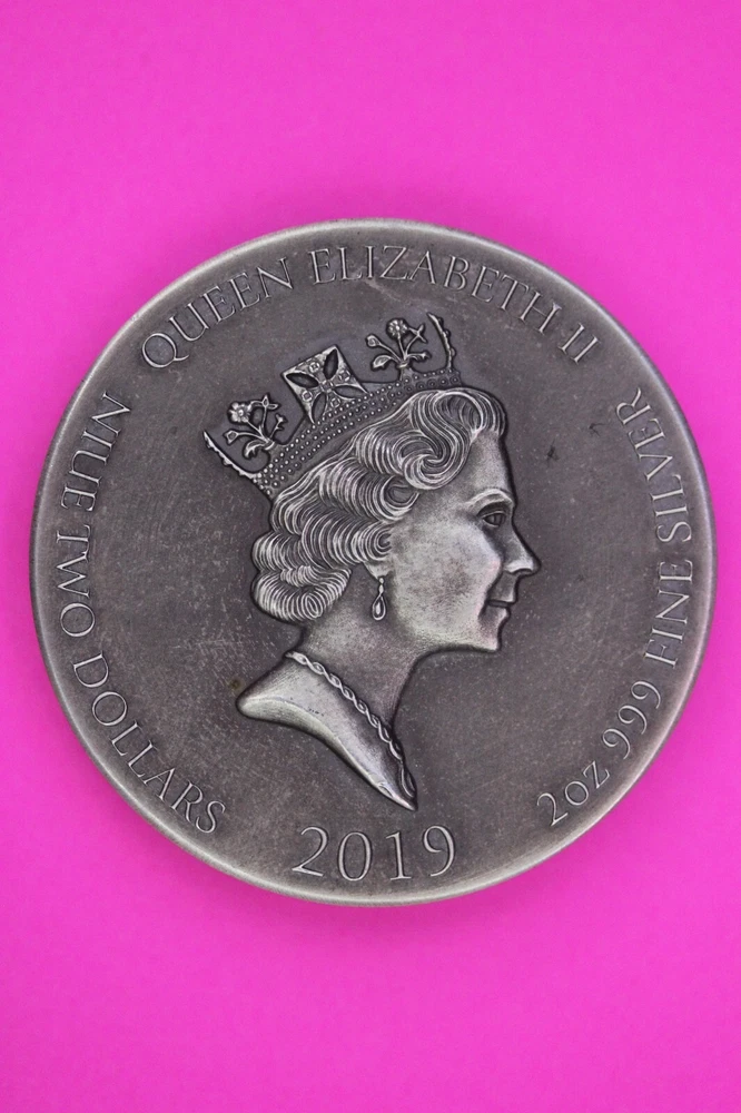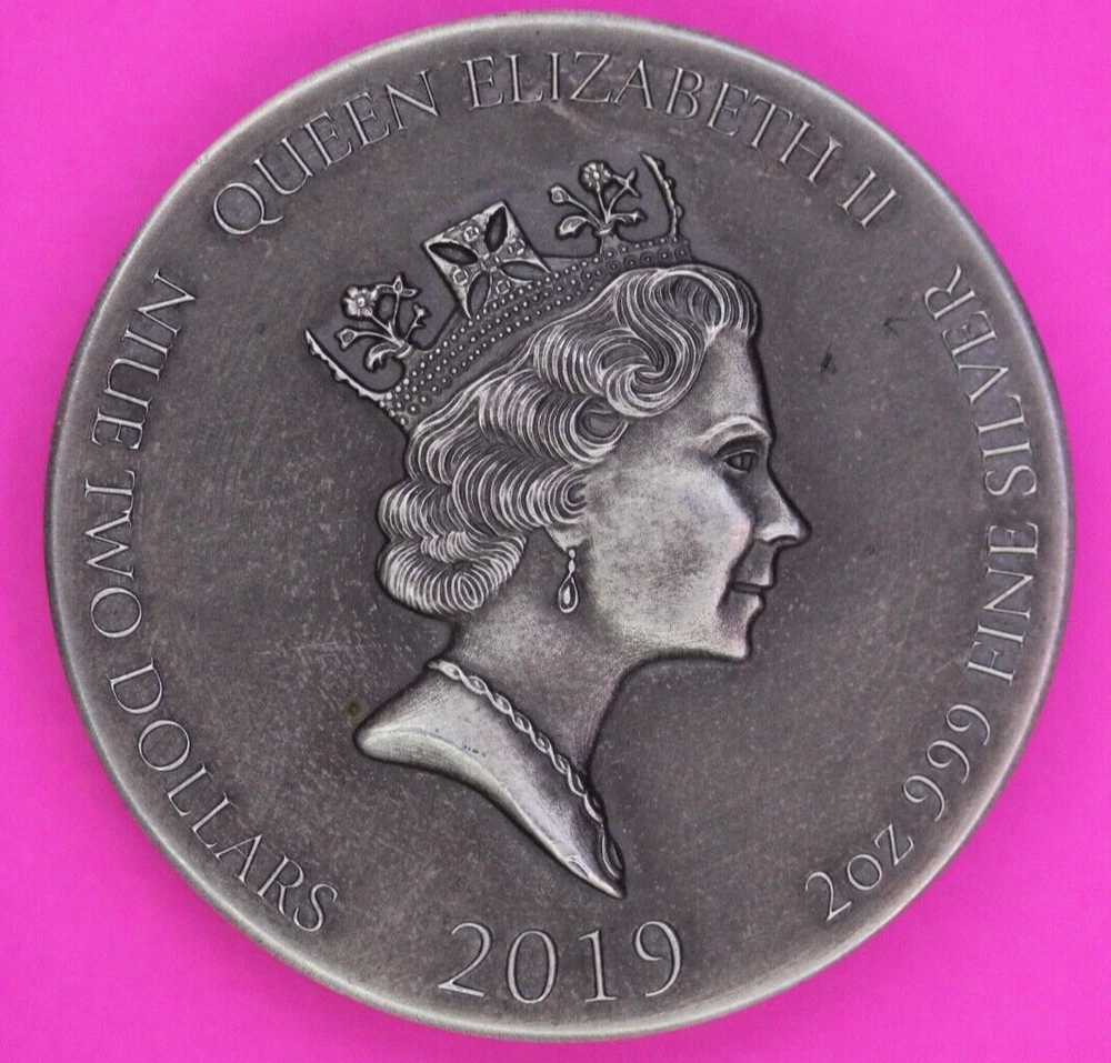 Year: 2019 Composition: Silver Coin: Niue Brand/Mint: New Zealand Mint Country/Region of Manufacture: Niue Grade: Ungraded Certification: Uncertified Strike Type: Antique Precious Metal Content per Unit: 2 oz