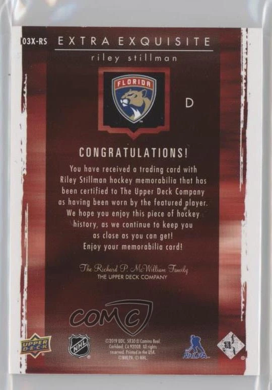 2019-20 Upper Deck Black Diamond - Exquisite Collection 03-04 Retro - Extra Exquisite Jersey #03X-RS Riley Stillman Qty Made: 75 - Rookie - Ice Hockey Card - Featuring the Florida Panthers - Featuring Riley Stillman Search for more: 2019-20 Upper Deck Black Diamond Search for more: 2019-20 Upper Deck Black Diamond - Exquisite Collection 03-04 Retro - Extra Exquisite Jersey View all of our Listings Auctions Buy It Now About Us Located in the beautiful Pacific Northwest, COMC (Check Out My Cards) is the world's largest consignment service for trading card singles. More than 10,000 people have used our consignment service to list over 50 million trading cards. We currently house 20 million cards, each listed for sale with front and back images of the actual card. Find out how we can help you consign your items on eBay by contacting us through eBay messaging. COMC -- "The Safe & Easy Way to Buy & Sell" Representative Image - Select Specific Item above to see image of actual item Representative Image - Select Specific Item above to see image of actual item Raw Condition for Modern Cards Unless otherwise noted, raw modern cards are listed in Near Mint-Mint condition or better. A NM-MT card appears to be Mint at first glance, but upon closer inspection, may exhibit some of the following: minor print defects (e.g. roller marks, print line, dimple), minor scratches, slight edge wear, and slight corner wear. Centering is clearly visible in the images provided and does not factor into our condition assessment. Raw Condition for Vintage Cards Unless otherwise noted, raw vintage cards are listed in Excellent condition or better. An EX card may exhibit some of the following: minor rounding of corners, surface wear, print defects, light scratches, and slight edge wear/chipping. Centering is clearly visible in the images provided and does not factor into our condition assessment. Domestic Shipping Combined shipping for multiple items is available. To receive combined shipping, please ensure all desired items are in your eBay shopping cart before proceeding to checkout. eBay limits orders to 40 items per order. We automatically combine multiple orders placed on the same day. If you place multiple orders on the same day, please contact us to request a refund of applicable shipping costs. Signature confirmation may be required on invoices over $400. Raw cards are shipped in toploaders. International Shipping COMC offers eBay's International Shipping (EIS) for international orders under $2,500* (see country exceptions below). All duties and import fees are paid at checkout; in the rare event that there are additional import fees upon delivery, these are borne by the buyer. EIS packages route through a shipping hub in Erlanger, KY before shipping to their final destination. Please note that EIS does not allow for combined shipments. The shipping rates are determined by eBay and cannot be adjusted. *Maximum sale price exceptions: Colombia, Kuwait ($2,000); Taiwan ($1,539); Chile, Costa Rica, Guatemala, Honduras, Trinidad and Tobago ($1,000); Antigua and Barbuda, Aruba, Belize, Dominica, Grenada, Philippines, Saint Kitts and Nevis, Saint Lucia, Montserrat, Turks and Caicos Islands ($500); Dominican Republic, El Salvador ($200). Please request a shipping quote through eBay messaging for orders that exceed the maximum sale price supported by eBay's International Shipping. You will be responsible for all duties and import fees for international orders shipped outside the EIS. Raw cards are shipped in toploaders. Payment COMC does not accept offers on our cards through our eBay storefront. COMC utilizes eBay’s managed payments system. If you are experiencing difficulties making a payment, please contact eBay for assistance. Return Policy Returns are only accepted on the rare occasion the item is not as described. If you are making a return, please initiate the return process through eBay so a mailing label can be provided for you. Prior to listing, our expert team carefully assessed this item to represent it accurately. Please review the description and high-definition images prior to purchasing to ensure this item meets your satisfaction. We welcome you to contact us if you have further questions about this item. Trust and Integrity COMC carefully assesses each item consigned to us to prevent fraudulent items from entering the marketplace. If you believe an item offered on COMC may be fraudulent, please contact us with details so we can investigate the issue. Items we determine are outside our supported items policy may be removed. Last Modified: 11/11/2024 12:00:58 PM PDT