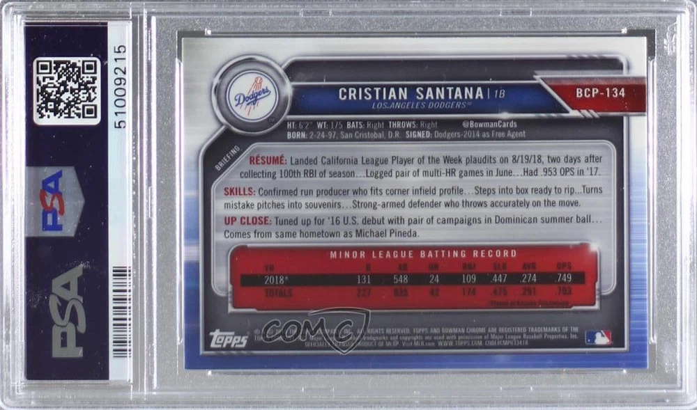 2019 Bowman - Chrome Prospects - Mega Box Mojo Refractor #BCP-134 Cristian Santana Graded PSA 9 MINT - Rookie - Baseball Card - Featuring the Los Angeles Dodgers - Featuring Cristian Santana Search for more: 2019 Bowman Search for more: 2019 Bowman - Chrome Prospects - Mega Box Mojo Refractor View all of our Listings Auctions Buy It Now About Us Located in the beautiful Pacific Northwest, COMC (Check Out My Cards) is the world's largest consignment service for trading card singles. More than 10,000 people have used our consignment service to list over 50 million trading cards. Find out how we can help you consign your items on eBay by contacting us through eBay messaging. COMC -- "The Safe & Easy Way to Buy & Sell" Representative Image - Select Specific Item above to see image of actual item Representative Image - Select Specific Item above to see image of actual item Raw Condition for Modern Cards Unless otherwise noted, raw modern cards are listed in Near Mint-Mint condition or better. A NM-MT card appears to be Mint at first glance, but upon closer inspection, may exhibit some of the following: minor print defects (e.g. roller marks, print line, dimple), minor scratches, slight edge wear, and slight corner wear. Centering is clearly visible in the images provided and does not factor into our condition assessment. Raw Condition for Vintage Cards Unless otherwise noted, raw vintage cards are listed in Excellent condition or better. An EX card may exhibit some of the following: minor rounding of corners, surface wear, print defects, light scratches, and slight edge wear/chipping. Centering is clearly visible in the images provided and does not factor into our condition assessment. Domestic Shipping Combined shipping for multiple items is available. To receive combined shipping, please ensure all desired items are in your eBay shopping cart before proceeding to checkout. eBay limits orders to 40 items per order. We automatically combine multiple orders placed on the same day. If you place multiple orders on the same day, please contact us to request a refund of applicable shipping costs. Signature confirmation may be required on invoices over $400. All cards are protected and shipped securely. International Shipping COMC offers eBay's International Shipping (EIS) for international orders under $2,500* (see country exceptions below). All duties and import fees are paid at checkout; in the rare event that there are additional import fees upon delivery, these are borne by the buyer. EIS packages route through a shipping hub in Erlanger, KY before shipping to their final destination. Please note that EIS does not allow for combined shipments. The shipping rates are determined by eBay and cannot be adjusted. *Maximum sale price exceptions: Colombia, Kuwait ($2,000); Taiwan ($1,539); Chile, Costa Rica, Guatemala, Honduras, Trinidad and Tobago ($1,000); Antigua and Barbuda, Aruba, Belize, Dominica, Grenada, Philippines, Saint Kitts and Nevis, Saint Lucia, Montserrat, Turks and Caicos Islands ($500); Dominican Republic, El Salvador ($200). Please request a shipping quote through eBay messaging for orders that exceed the maximum sale price supported by eBay's International Shipping. You will be responsible for all duties and import fees for international orders shipped outside the EIS. All cards are protected and shipped securely. Payment COMC does not accept offers on our cards through our eBay storefront. COMC utilizes eBay’s managed payments system. If you are experiencing difficulties making a payment, please contact eBay for assistance. Return Policy Returns are only accepted on the rare occasion the item is not as described. If you are making a return, please initiate the return process through eBay so a mailing label can be provided for you. Prior to listing, our expert team carefully assessed this item to represent it accurately. Please review the description and high-definition images prior to purchasing to ensure this item meets your satisfaction. We welcome you to contact us if you have further questions about this item. Trust and Integrity COMC carefully assesses each item consigned to us to prevent fraudulent items from entering the marketplace. If you believe an item offered on COMC may be fraudulent, please contact us with details so we can investigate the issue. Items we determine are outside our supported items policy may be removed. Last Modified: 1/30/2025 5:26:11 PM PDT