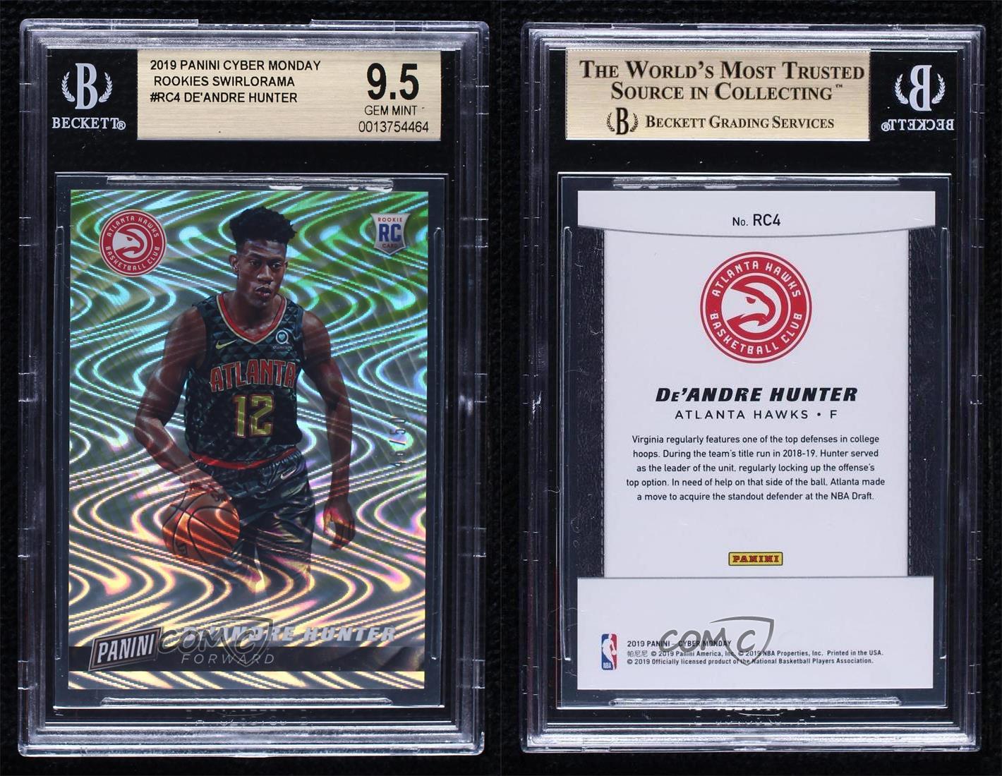 2019 Panini Cyber Monday - Rookies - Swirlorama #RC4 De'Andre Hunter Qty Made: 50 Graded BGS 9.5 GEM MINT - Rookie - MultiSport Card - Featuring the Atlanta Hawks - Featuring De'Andre Hunter Search for more: 2019 Panini Cyber Monday Search for more: 2019 Panini Cyber Monday - Rookies - Swirlorama View all of our Listings Auctions Buy It Now About Us Located in the beautiful Pacific Northwest, COMC (Check Out My Cards) is the world's largest consignment service for trading card singles. More than 10,000 people have used our consignment service to list over 50 million trading cards. We currently house 20 million cards, each listed for sale with front and back images of the actual card. Find out how we can help you consign your items on eBay by contacting us through eBay messaging. COMC -- "The Safe & Easy Way to Buy & Sell" Representative Image - Select Specific Item above to see image of actual item Representative Image - Select Specific Item above to see image of actual item Raw Condition for Modern Cards Unless otherwise noted, raw modern cards are listed in Near Mint-Mint condition or better. A NM-MT card appears to be Mint at first glance, but upon closer inspection, may exhibit some of the following: minor print defects (e.g. roller marks, print line, dimple), minor scratches, slight edge wear, and slight corner wear. Centering is clearly visible in the images provided and does not factor into our condition assessment. Raw Condition for Vintage Cards Unless otherwise noted, raw vintage cards are listed in Excellent condition or better. An EX card may exhibit some of the following: minor rounding of corners, surface wear, print defects, light scratches, and slight edge wear/chipping. Centering is clearly visible in the images provided and does not factor into our condition assessment. Domestic Shipping Combined shipping for multiple items is available. To receive combined shipping, please ensure all desired items are in your eBay shopping cart before proceeding to checkout. eBay limits orders to 40 items per order. We automatically combine multiple orders placed on the same day. If you place multiple orders on the same day, please contact us to request a refund of applicable shipping costs. Signature confirmation may be required on invoices over $400. Raw cards are shipped in toploaders. International Shipping COMC offers eBay's International Shipping (EIS) for international orders under $2,500* (see country exceptions below). All duties and import fees are paid at checkout; in the rare event that there are additional import fees upon delivery, these are borne by the buyer. EIS packages route through a shipping hub in Erlanger, KY before shipping to their final destination. Please note that EIS does not allow for combined shipments. The shipping rates are determined by eBay and cannot be adjusted. *Maximum sale price exceptions: Colombia, Kuwait ($2,000); Taiwan ($1,539); Chile, Costa Rica, Guatemala, Honduras, Trinidad and Tobago ($1,000); Antigua and Barbuda, Aruba, Belize, Dominica, Grenada, Philippines, Saint Kitts and Nevis, Saint Lucia, Montserrat, Turks and Caicos Islands ($500); Dominican Republic, El Salvador ($200). Please request a shipping quote through eBay messaging for orders that exceed the maximum sale price supported by eBay's International Shipping. You will be responsible for all duties and import fees for international orders shipped outside the EIS. Raw cards are shipped in toploaders. Payment COMC does not accept offers on our cards through our eBay storefront. COMC utilizes eBay’s managed payments system. If you are experiencing difficulties making a payment, please contact eBay for assistance. Return Policy Returns are only accepted on the rare occasion the item is not as described. If you are making a return, please initiate the return process through eBay so a mailing label can be provided for you. Prior to listing, our expert team carefully assessed this item to represent it accurately. Please review the description and high-definition images prior to purchasing to ensure this item meets your satisfaction. We welcome you to contact us if you have further questions about this item. Trust and Integrity COMC carefully assesses each item consigned to us to prevent fraudulent items from entering the marketplace. If you believe an item offered on COMC may be fraudulent, please contact us with details so we can investigate the issue. Items we determine are outside our supported items policy may be removed. Last Modified: 10/20/2024 3:17:11 AM PDT
