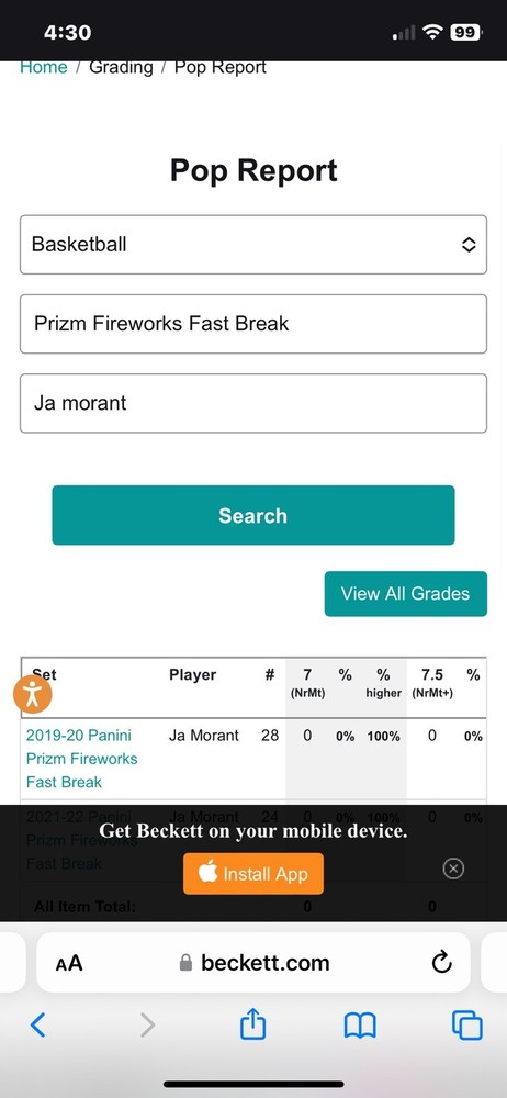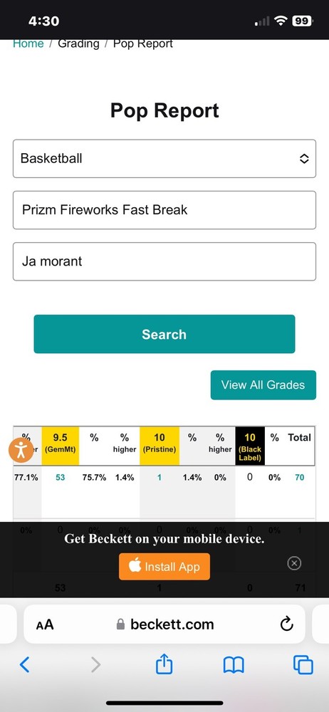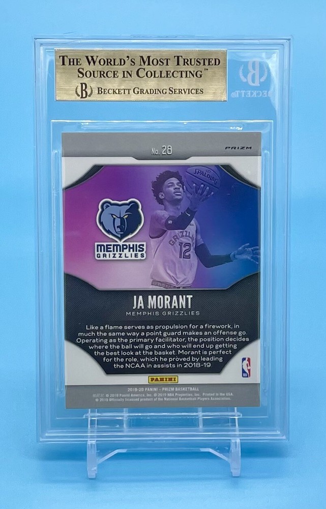 This 2019 Panini Prizm basketball trading card features Ja Morant of the Memphis Grizzlies in an action-packed design with Fast Break Disco Prizm parallel/variety. Graded 9.5 True Gem Mint by Beckett Grading Services (BGS), this rookie card has a certification number of 0013420078 and a low population of only 53. The card also boasts several features including being serial numbered, a Fast Break insert, short print, and Disco parallel/variety. The front of the card showcases Morant on the court with an intense expression as he prepares to make a move. This sports trading card is perfect for collectors and fans of the National Basketball Association (NBA). Note: My wife and I are committed to donating a percentage of the proceeds to “Austin Pet’s Alive” no kill shelter with every purchase. Please be part of helping us reach our goal this year in raising at least $25,000. As always, if you are a return customer or a brand new face, we would love to hear feedback or answer any questions you have. Thank you and have an awesome day!