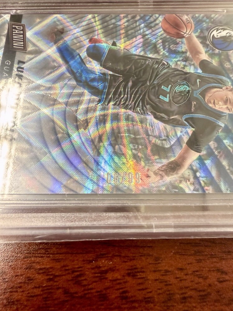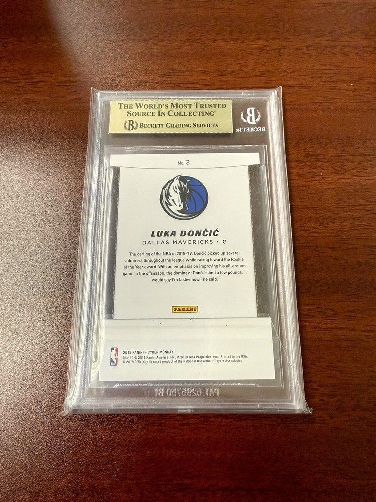 It is a 2019 Panini Cyber Monday sports trading card featuring Luka Dončić of the Dallas Mavericks. The card is a Future Frames parallel with a print run of /99 and a BGS 9.5 Gem Mint grade. It is serial numbered and a limited edition exclusive card. This specific card is number 3 in the set and has a population of only 3 graded by Beckett Grading Services.