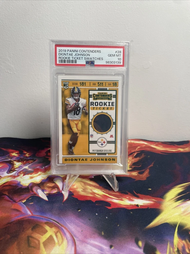 This 2019 Panini Contenders sports trading card features Diontae Johnson, a rookie player in the National Football League (NFL). The card number is RTS-28 and it has been professionally graded by the Professional Sports Authenticator (PSA) with a grade of 10. The card is part of the 2019 set and has several desirable features, including a swatch of Johnson's game-worn jersey. This card is perfect for avid collectors of sports memorabilia and fans of the NFL. It is a must-have for any collector looking to add a rare and valuable card to their collection. Don't miss out on the opportunity to own this highly sought-after card.