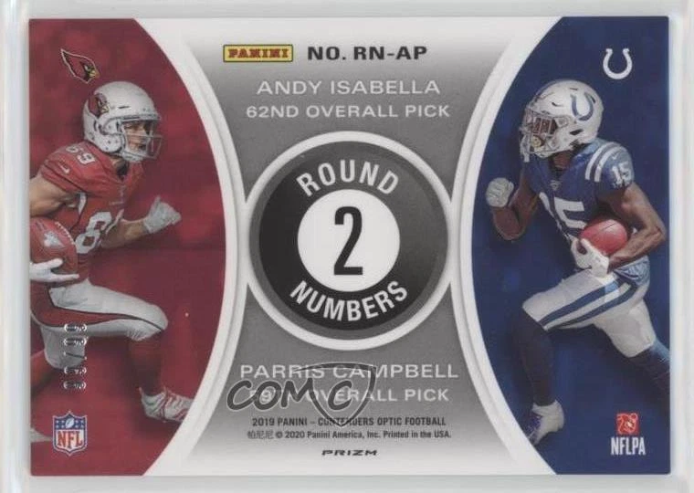2019 Panini Contenders Optic - Round Numbers - Blue #RN-AP Andy Isabella, Parris Campbell Qty Made: 99 - Rookie - Football Card - Featuring the Indianapolis Colts and Arizona Cardinals - Featuring Andy Isabella and Parris Campbell Search for more: 2019 Panini Contenders Optic Search for more: 2019 Panini Contenders Optic - Round Numbers - Blue View all of our Listings Auctions Buy It Now About Us Located in the beautiful Pacific Northwest, COMC (Check Out My Cards) is the world's largest consignment service for trading card singles. More than 10,000 people have used our consignment service to list over 50 million trading cards. We currently house 20 million cards, each listed for sale with front and back images of the actual card. Find out how we can help you consign your items on eBay by contacting us through eBay messaging. COMC -- "The Safe & Easy Way to Buy & Sell" Representative Image - Select Specific Item above to see image of actual item Representative Image - Select Specific Item above to see image of actual item Raw Condition for Modern Cards Unless otherwise noted, raw modern cards are listed in Near Mint-Mint condition or better. A NM-MT card appears to be Mint at first glance, but upon closer inspection, may exhibit some of the following: minor print defects (e.g. roller marks, print line, dimple), minor scratches, slight edge wear, and slight corner wear. Centering is clearly visible in the images provided and does not factor into our condition assessment. Raw Condition for Vintage Cards Unless otherwise noted, raw vintage cards are listed in Excellent condition or better. An EX card may exhibit some of the following: minor rounding of corners, surface wear, print defects, light scratches, and slight edge wear/chipping. Centering is clearly visible in the images provided and does not factor into our condition assessment. Domestic Shipping Combined shipping for multiple items is available. To receive combined shipping, please ensure all desired items are in your eBay shopping cart before proceeding to checkout. eBay limits orders to 40 items per order. We automatically combine multiple orders placed on the same day. If you place multiple orders on the same day, please contact us to request a refund of applicable shipping costs. Signature confirmation may be required on invoices over $400. Raw cards are shipped in toploaders. International Shipping COMC offers eBay's International Shipping (EIS) for international orders under $2,500* (see country exceptions below). All duties and import fees are paid at checkout; in the rare event that there are additional import fees upon delivery, these are borne by the buyer. EIS packages route through a shipping hub in Erlanger, KY before shipping to their final destination. Please note that EIS does not allow for combined shipments. The shipping rates are determined by eBay and cannot be adjusted. *Maximum sale price exceptions: Colombia, Kuwait ($2,000); Taiwan ($1,539); Chile, Costa Rica, Guatemala, Honduras, Trinidad and Tobago ($1,000); Antigua and Barbuda, Aruba, Belize, Dominica, Grenada, Philippines, Saint Kitts and Nevis, Saint Lucia, Montserrat, Turks and Caicos Islands ($500); Dominican Republic, El Salvador ($200). Please request a shipping quote through eBay messaging for orders that exceed the maximum sale price supported by eBay's International Shipping. You will be responsible for all duties and import fees for international orders shipped outside the EIS. Raw cards are shipped in toploaders. Payment COMC does not accept offers on our cards through our eBay storefront. COMC utilizes eBay’s managed payments system. If you are experiencing difficulties making a payment, please contact eBay for assistance. Return Policy Returns are only accepted on the rare occasion the item is not as described. If you are making a return, please initiate the return process through eBay so a mailing label can be provided for you. Prior to listing, our expert team carefully assessed this item to represent it accurately. Please review the description and high-definition images prior to purchasing to ensure this item meets your satisfaction. We welcome you to contact us if you have further questions about this item. Trust and Integrity COMC carefully assesses each item consigned to us to prevent fraudulent items from entering the marketplace. If you believe an item offered on COMC may be fraudulent, please contact us with details so we can investigate the issue. Items we determine are outside our supported items policy may be removed. Last Modified: 11/30/2024 10:53:09 PM PDT