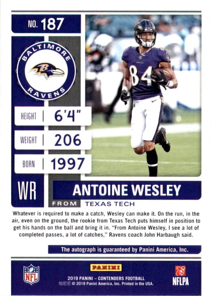 This is a nice example of a 2019 Panini Contenders #187 Antoine Wesley Championship Ticket.Other important information about this card: SN,RC,AUIn 2019 Antoine Wesley played for the Baltimore Ravens.Please check out our other listings for more great cards. Shipping can be combined! First card is $1.25 - each additional card is $0.50. Up to 2 cards will be toploaded, additional cards won/paid for will be in a penny sleeve. Thank you for your business!