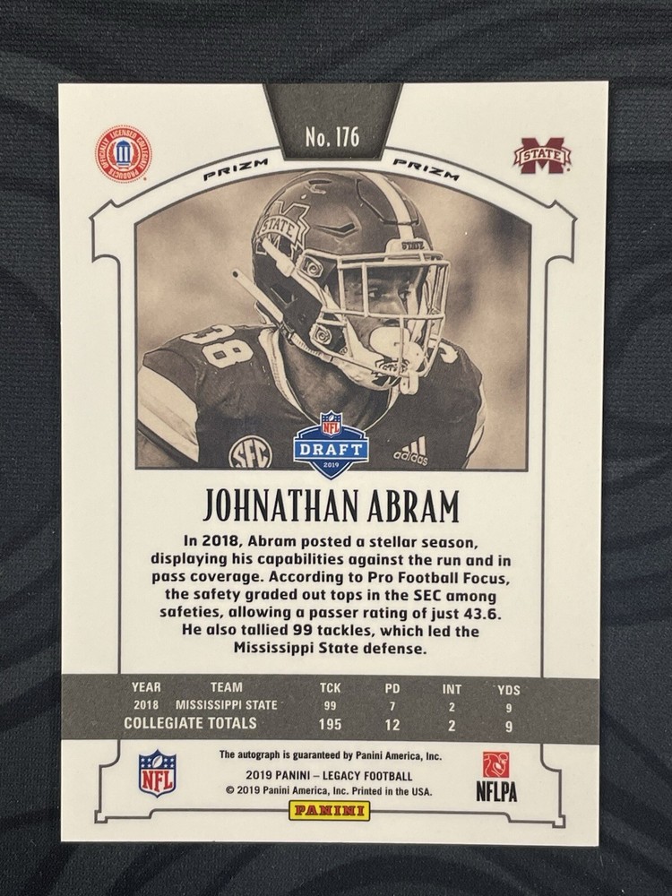 The product is a 2019 Panini Legacy trading card featuring Johnathan Abram of the Las Vegas Raiders. This specific card is autographed by Abram and is a Rookie Card (RC) with a Silver Parallel/Variety. It is part of the 2019 Panini Legacy set, with a card number of 176. This trading card would be highly sought after by fans and collectors of football memorabilia, especially those interested in collecting autographed rookie cards from promising players like Johnathan Abram.