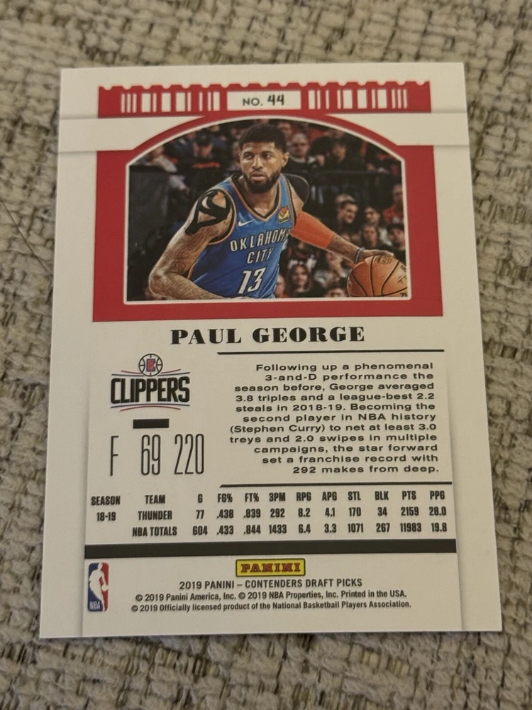 Manufacturer: Panini Parallel/Variety: Red Foil Season: 2019 Type: Sports Trading Card Card Number: 44 Player/Athlete: Paul George Set: 2019 Panini Contenders Draft Picks Sport: Basketball