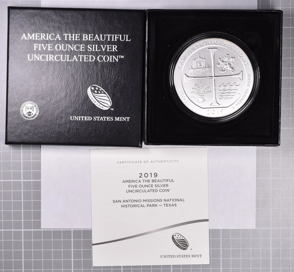 2019 San Antonio Missions 5 oz Silver - Uncirculated With Box & COA Item in photos is the actual item you will receive, except when "STOCK PHOTOS" is noted above. Item ID: 79858 Shipping: We combine shipping for multiple item purchases - MUST BE PAID TOGETHER! PLEASE - Bid and buy at your leisure for combined shipping - we request you pay combined items within 10 days of first item won. We are unable to honor requests for combined shipping discounts if items have been paid separately. eBay does show our combined shipping on the shipping tab. If you're purchasing a large number of items, or several boxed items, request a total from seller and we'll pre-pack to get you an accurate shipping cost. We use Flat Rate mailing supplies as much as possible. FAST shipping via United States Postal Service (USPS) We ship Monday - Friday every week, excluding holidays. Most orders paid by 10AM Eastern Time on weekdays will ship same day. When your order is ready for dispatch: - Tracking will be updated on the order details - Tracking will be e-mailed to your registered eBay e-mail address - Positive feedback will be left. If you have not received tracking details or Positive Feedback within 5 days of your payment, contact us through your order details page. Insurance: Your investment is covered by third party parcel insurance and/or U.S. Postal Service Insurance. By bidding/buying, you agree to cooperate with the insurance claims process on lost, stolen, or damaged shipments. If you would like details on the claims process before bidding, feel free to e-mail us. Tax: eBay collects and administers the Sales Tax on a per-state basis. We have no control over the administration of tax. Requests for refunds of Sales Tax will not be honored. If you feel an exemption is warranted, we can only recommend you contact eBay directly. Returns: We accept returns for refund on all unaltered items within 30 days. - Coins removed from their packaging are non returnable. - Items sold as sealed or unopened are non returnable if opened. - We do not charge a restocking fee nor do we refund postage charges. All returns must be handled through eBay's automated return process. No returns on items marked FINAL SALE or AS-IS.