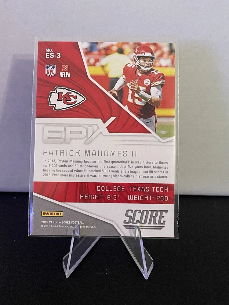 This 2019 Score card features Patrick Mahomes II, the Kansas City Chiefs quarterback, with the card number ES-3. It is a part of the Epix Season insert set and is a future Hall of Fame card. The card is from the NFL and was manufactured by SCORE in 2019. The card is not autographed and is a sports trading card of the type Trading Card Singles. The card is a parallel/variety of the Epix Season and is the perfect addition to any football fan's collection.