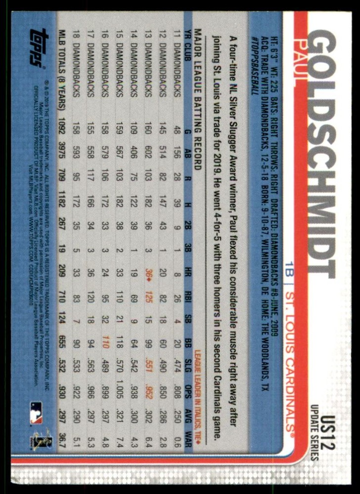 2019 Topps Update 150th Anniversary #US12 Paul Goldschmidt Front Back Sport: Baseball Set: 2019 Topps Update 150th Anniversary Year: 2019 Item#: US12 Player: Paul Goldschmidt Team: St. Louis Cardinals BB Brand: Topps Update Manufacturer: Topps Co. Grading Company: Raw Grade SetType: Parallel Item Condition: Near Mint/Mint 2014 Beckett Collectibles, LLC. All Rights Reserved Powered by: Thank you for choosing Burbank Sportscards, the sports cards superstore. We offer a large selection of singles across all sports. Visit our ebay store to view all our items available. Our Shipping Policy We offer Free Standard Shipping to all Domestic customers. Options for Expedited shipping are also available at checkout. For our international customers, shipping is $9.99 for the first item, and $0.25 for each additional item. Note to all customers: To qualify for combines shipping, we ask our customers to add items into the shopping cart. Please note, we do not combine orders that are placed separately. Our Service: Generally, our turnaround is super quick as we process and send out orders same day payment is received. Stock Availability: We do our best to ensure all items are in stock; however, in case of the rare stock out, the customer will have the option for a replacement card, or we will process a refund so the order is not held up. Our Images: Many of our images are stock photos from Beckett archives. They are a representation of the actual card you would receive. If you have any questions regarding the item you're interested in, please feel free to ask (serial numbers and relic pieces may vary) Moreover, in a case of a wrong or defective photo, please notify us, so we can adjust it. Other FAQ's: -When buying multiple cards, do you top load each item? No; however, we do try to insure all items are shipped securely. If you wish to have all of your cards top loaded it is a paid service and can be arranged. Please email for more details. For other questions, please feel free to ask. Thank you.