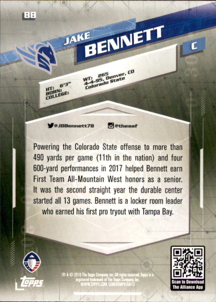 2019 Topps AAF #88 Jake Bennett Rookie Card Front Back Sport: Football Set: 2019 Topps AAF Year: 2019 Item#: 88 Player: Jake Bennett Team: Salt Lake Stallions Attributes: Rookie Brand: Topps AAF Manufacturer: Topps Co. Grading Company: Raw Grade SetType: Main Item Condition: Near Mint/Mint 2014 Beckett Collectibles, LLC. All Rights Reserved Powered by: Thank you for choosing Burbank Sportscards, the sports cards superstore. We offer a large selection of singles across all sports. Visit our ebay store to view all our items available. Our Shipping Policy We offer Free Standard Shipping to all Domestic customers. Options for Expedited shipping are also available at checkout. For our international customers, shipping is $9.99 for the first item, and $0.25 for each additional item. Note to all customers: To qualify for combines shipping, we ask our customers to add items into the shopping cart. Please note, we do not combine orders that are placed separately. Our Service: Generally, our turnaround is super quick as we process and send out orders same day payment is received. Stock Availability: We do our best to ensure all items are in stock; however, in case of the rare stock out, the customer will have the option for a replacement card, or we will process a refund so the order is not held up. Our Images: Many of our images are stock photos from Beckett archives. They are a representation of the actual card you would receive. If you have any questions regarding the item you're interested in, please feel free to ask (serial numbers and relic pieces may vary) Moreover, in a case of a wrong or defective photo, please notify us, so we can adjust it. Other FAQ's: -When buying multiple cards, do you top load each item? No; however, we do try to insure all items are shipped securely. If you wish to have all of your cards top loaded it is a paid service and can be arranged. Please email for more details. For other questions, please feel free to ask. Thank you.