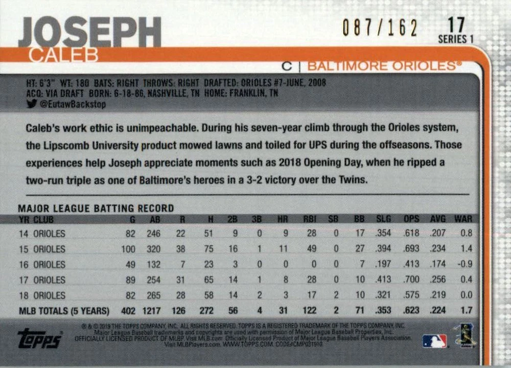 2019 Topps Factory Set Sparkle Foil #17 Caleb Joseph /162 Front Back Sport: Baseball Set: 2019 Topps Factory Set Sparkle Foil Year: 2019 Item#: 17 Player: Caleb Joseph Team: Baltimore Orioles Attributes: Serial Numbered Brand: Topps Manufacturer: Topps Co. Grading Company: Raw Grade SetType: Parallel Item Condition: Near Mint/Mint 2014 Beckett Collectibles, LLC. All Rights Reserved Powered by: Thank you for choosing Burbank Sportscards, the sports cards superstore. We offer a large selection of singles across all sports. Visit our ebay store to view all our items available. Our Shipping Policy We offer Free Standard Shipping to all Domestic customers. Options for Expedited shipping are also available at checkout. For our international customers, shipping is $9.99 for the first item, and $0.25 for each additional item. Note to all customers: To qualify for combines shipping, we ask our customers to add items into the shopping cart. Please note, we do not combine orders that are placed separately. Our Service: Generally, our turnaround is super quick as we process and send out orders same day payment is received. Stock Availability: We do our best to ensure all items are in stock; however, in case of the rare stock out, the customer will have the option for a replacement card, or we will process a refund so the order is not held up. Our Images: Many of our images are stock photos from Beckett archives. They are a representation of the actual card you would receive. If you have any questions regarding the item you're interested in, please feel free to ask (serial numbers and relic pieces may vary) Moreover, in a case of a wrong or defective photo, please notify us, so we can adjust it. Other FAQ's: -When buying multiple cards, do you top load each item? No; however, we do try to insure all items are shipped securely. If you wish to have all of your cards top loaded it is a paid service and can be arranged. Please email for more details. For other questions, please feel free to ask. Thank you.