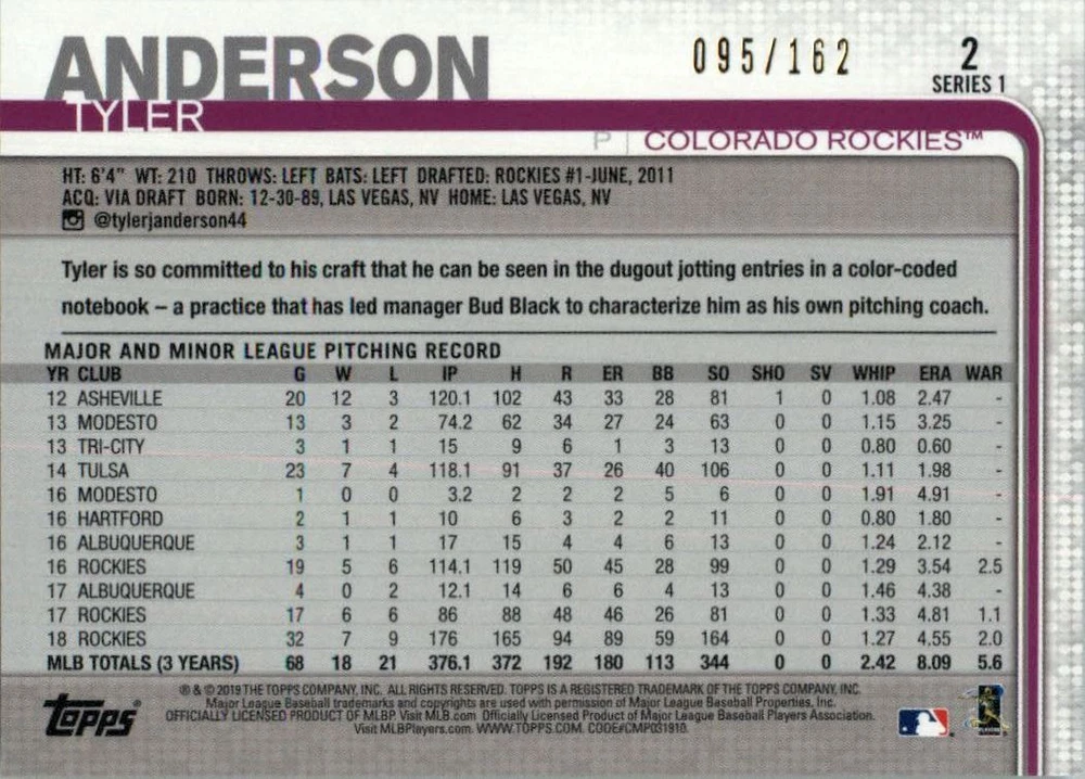 2019 Topps Factory Set Sparkle Foil #2 Tyler Anderson /162 Front Back Sport: Baseball Set: 2019 Topps Factory Set Sparkle Foil Year: 2019 Item#: 2 Player: Tyler Anderson Team: Colorado Rockies BB Attributes: Serial Numbered Brand: Topps Manufacturer: Topps Co. Grading Company: Raw Grade SetType: Parallel Item Condition: Near Mint/Mint 2014 Beckett Collectibles, LLC. All Rights Reserved Powered by: Thank you for choosing Burbank Sportscards, the sports cards superstore. We offer a large selection of singles across all sports. Visit our ebay store to view all our items available. Our Shipping Policy We offer Free Standard Shipping to all Domestic customers. Options for Expedited shipping are also available at checkout. For our international customers, shipping is $9.99 for the first item, and $0.25 for each additional item. Note to all customers: To qualify for combines shipping, we ask our customers to add items into the shopping cart. Please note, we do not combine orders that are placed separately. Our Service: Generally, our turnaround is super quick as we process and send out orders same day payment is received. Stock Availability: We do our best to ensure all items are in stock; however, in case of the rare stock out, the customer will have the option for a replacement card, or we will process a refund so the order is not held up. Our Images: Many of our images are stock photos from Beckett archives. They are a representation of the actual card you would receive. If you have any questions regarding the item you're interested in, please feel free to ask (serial numbers and relic pieces may vary) Moreover, in a case of a wrong or defective photo, please notify us, so we can adjust it. Other FAQ's: -When buying multiple cards, do you top load each item? No; however, we do try to insure all items are shipped securely. If you wish to have all of your cards top loaded it is a paid service and can be arranged. Please email for more details. For other questions, please feel free to ask. Thank you.