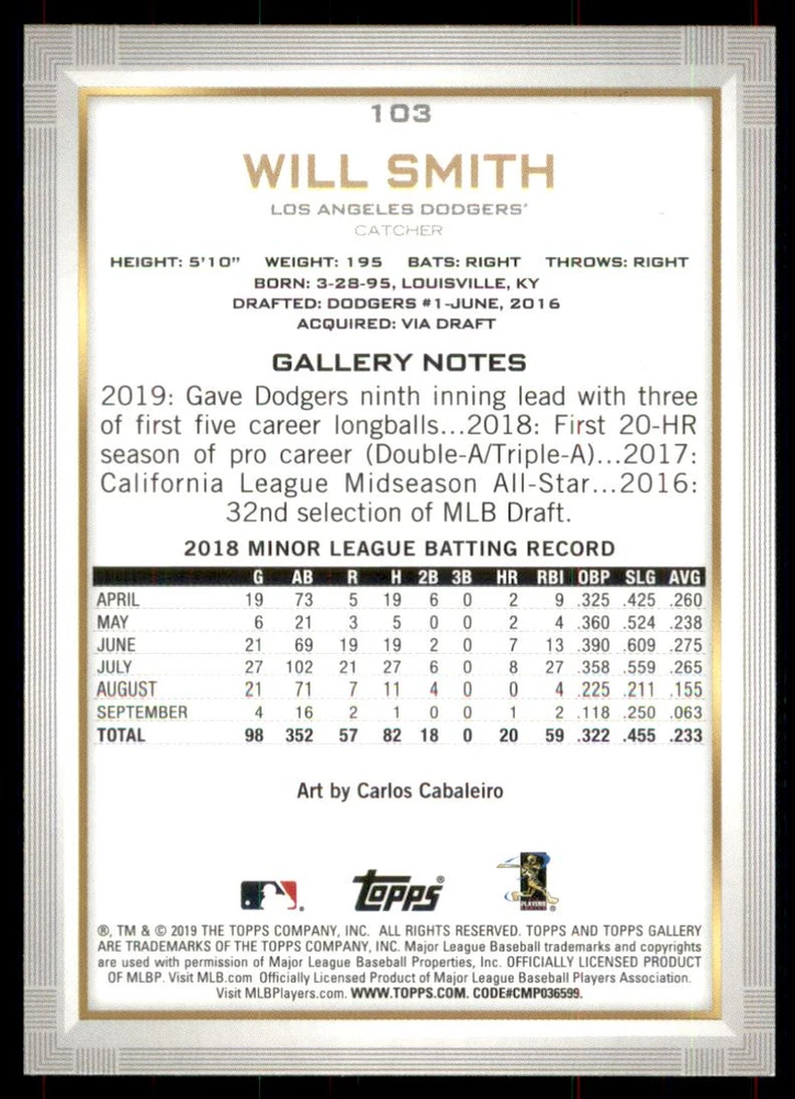 2019 Topps Gallery #103 Will Smith Rookie Card Front Back Sport: Baseball Set: 2019 Topps Gallery Year: 2019 Item#: 103 Player: Will Smith Team: Los Angeles Dodgers Attributes: Rookie Brand: Topps Gallery Manufacturer: Topps Co. Grading Company: Raw Grade SetType: Main Item Condition: Near Mint/Mint 2014 Beckett Collectibles, LLC. All Rights Reserved Powered by: Thank you for choosing Burbank Sportscards, the sports cards superstore. We offer a large selection of singles across all sports. Visit our ebay store to view all our items available. Our Shipping Policy We offer Free Standard Shipping to all Domestic customers. Options for Expedited shipping are also available at checkout. For our international customers, shipping is $9.99 for the first item, and $0.25 for each additional item. Note to all customers: To qualify for combines shipping, we ask our customers to add items into the shopping cart. Please note, we do not combine orders that are placed separately. Our Service: Generally, our turnaround is super quick as we process and send out orders same day payment is received. Stock Availability: We do our best to ensure all items are in stock; however, in case of the rare stock out, the customer will have the option for a replacement card, or we will process a refund so the order is not held up. Our Images: Many of our images are stock photos from Beckett archives. They are a representation of the actual card you would receive. If you have any questions regarding the item you're interested in, please feel free to ask (serial numbers and relic pieces may vary) Moreover, in a case of a wrong or defective photo, please notify us, so we can adjust it. Other FAQ's: -When buying multiple cards, do you top load each item? No; however, we do try to insure all items are shipped securely. If you wish to have all of your cards top loaded it is a paid service and can be arranged. Please email for more details. For other questions, please feel free to ask. Thank you.
