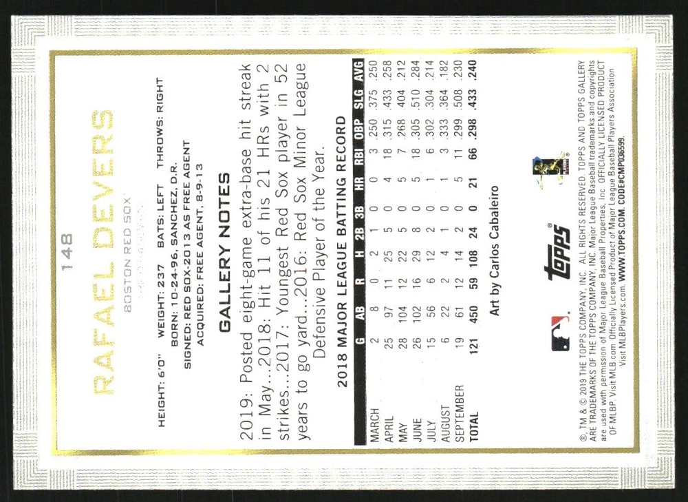 2019 Topps Gallery Artist Proof #148 Rafael Devers Front Back Sport: Baseball Set: 2019 Topps Gallery Artist Proof Year: 2019 Item#: 148 Player: Rafael Devers Team: Boston Red Sox Brand: Topps Gallery Manufacturer: Topps Co. Grading Company: Raw Grade SetType: Parallel Item Condition: Near Mint/Mint 2014 Beckett Collectibles, LLC. All Rights Reserved Powered by: Thank you for choosing Burbank Sportscards, the sports cards superstore. We offer a large selection of singles across all sports. Visit our ebay store to view all our items available. Our Shipping Policy We offer Free Standard Shipping to all Domestic customers. Options for Expedited shipping are also available at checkout. For our international customers, shipping is $9.99 for the first item, and $0.25 for each additional item. Note to all customers: To qualify for combines shipping, we ask our customers to add items into the shopping cart. Please note, we do not combine orders that are placed separately. Our Service: Generally, our turnaround is super quick as we process and send out orders same day payment is received. Stock Availability: We do our best to ensure all items are in stock; however, in case of the rare stock out, the customer will have the option for a replacement card, or we will process a refund so the order is not held up. Our Images: Many of our images are stock photos from Beckett archives. They are a representation of the actual card you would receive. If you have any questions regarding the item you're interested in, please feel free to ask (serial numbers and relic pieces may vary) Moreover, in a case of a wrong or defective photo, please notify us, so we can adjust it. Other FAQ's: -When buying multiple cards, do you top load each item? No; however, we do try to insure all items are shipped securely. If you wish to have all of your cards top loaded it is a paid service and can be arranged. Please email for more details. For other questions, please feel free to ask. Thank you.