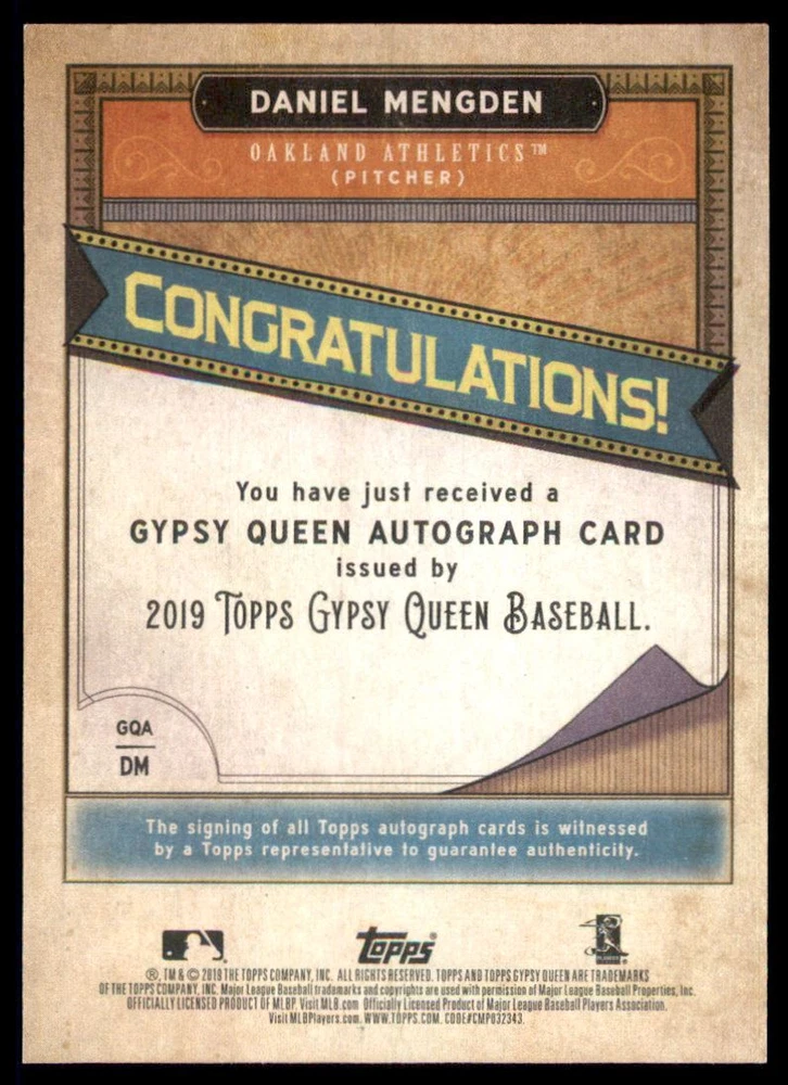2019 Topps Gypsy Queen Autographs #GQADM Daniel Mengden Front Back Sport: Baseball Set: 2019 Topps Gypsy Queen Autographs Year: 2019 Item#: GQADM Player: Daniel Mengden Team: Oakland Athletics Attributes: Autograph Brand: Topps Gypsy Queen Manufacturer: Topps Co. Grading Company: Raw Grade SetType: Insert Item Condition: Near Mint/Mint 2014 Beckett Collectibles, LLC. All Rights Reserved Powered by: Thank you for choosing Burbank Sportscards, the sports cards superstore. We offer a large selection of singles across all sports. Visit our ebay store to view all our items available. Our Shipping Policy We offer Free Standard Shipping to all Domestic customers. Options for Expedited shipping are also available at checkout. For our international customers, shipping is $9.99 for the first item, and $0.25 for each additional item. Note to all customers: To qualify for combines shipping, we ask our customers to add items into the shopping cart. Please note, we do not combine orders that are placed separately. Our Service: Generally, our turnaround is super quick as we process and send out orders same day payment is received. Stock Availability: We do our best to ensure all items are in stock; however, in case of the rare stock out, the customer will have the option for a replacement card, or we will process a refund so the order is not held up. Our Images: Many of our images are stock photos from Beckett archives. They are a representation of the actual card you would receive. If you have any questions regarding the item you're interested in, please feel free to ask (serial numbers and relic pieces may vary) Moreover, in a case of a wrong or defective photo, please notify us, so we can adjust it. Other FAQ's: -When buying multiple cards, do you top load each item? No; however, we do try to insure all items are shipped securely. If you wish to have all of your cards top loaded it is a paid service and can be arranged. Please email for more details. For other questions, please feel free to ask. Thank you.