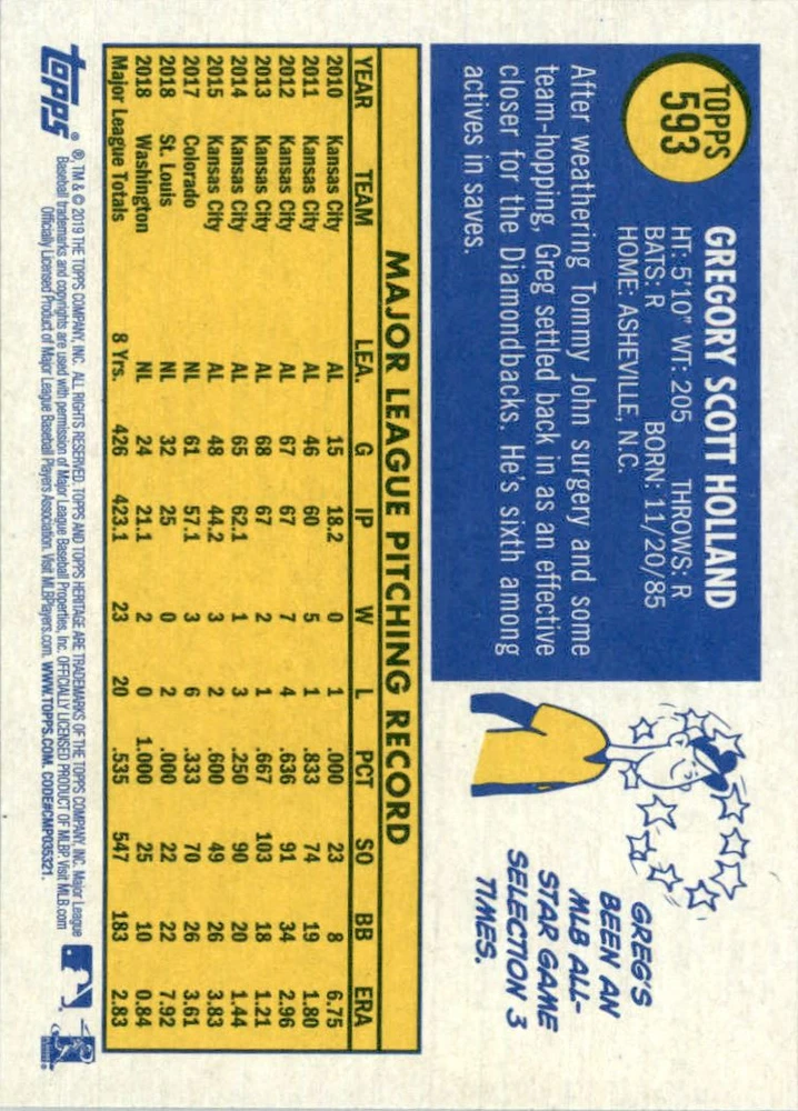 2019 Topps Heritage #593 Greg Holland Front Back Sport: Baseball Set: 2019 Topps Heritage Year: 2019 Item#: 593 Player: Greg Holland Team: Arizona Diamondbacks Brand: Topps Heritage Manufacturer: Topps Co. Grading Company: Raw Grade SetType: Main Item Condition: Near Mint/Mint 2014 Beckett Collectibles, LLC. All Rights Reserved Powered by: Thank you for choosing Burbank Sportscards, the sports cards superstore. We offer a large selection of singles across all sports. Visit our ebay store to view all our items available. Our Shipping Policy We offer Free Standard Shipping to all Domestic customers. Options for Expedited shipping are also available at checkout. For our international customers, shipping is $9.99 for the first item, and $0.25 for each additional item. Note to all customers: To qualify for combines shipping, we ask our customers to add items into the shopping cart. Please note, we do not combine orders that are placed separately. Our Service: Generally, our turnaround is super quick as we process and send out orders same day payment is received. Stock Availability: We do our best to ensure all items are in stock; however, in case of the rare stock out, the customer will have the option for a replacement card, or we will process a refund so the order is not held up. Our Images: Many of our images are stock photos from Beckett archives. They are a representation of the actual card you would receive. If you have any questions regarding the item you're interested in, please feel free to ask (serial numbers and relic pieces may vary) Moreover, in a case of a wrong or defective photo, please notify us, so we can adjust it. Other FAQ's: -When buying multiple cards, do you top load each item? No; however, we do try to insure all items are shipped securely. If you wish to have all of your cards top loaded it is a paid service and can be arranged. Please email for more details. For other questions, please feel free to ask. Thank you.
