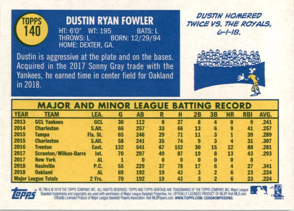 2019 Topps Heritage Black Border #140 Dustin Fowler Front Back Sport: Baseball Set: 2019 Topps Heritage Black Border Year: 2019 Item#: 140 Player: Dustin Fowler Team: Oakland Athletics Brand: Topps Heritage Manufacturer: Topps Co. Grading Company: Raw Grade SetType: Parallel Item Condition: Near Mint/Mint 2014 Beckett Collectibles, LLC. All Rights Reserved Powered by: Thank you for choosing Burbank Sportscards, the sports cards superstore. We offer a large selection of singles across all sports. Visit our ebay store to view all our items available. Our Shipping Policy We offer Free Standard Shipping to all Domestic customers. Options for Expedited shipping are also available at checkout. For our international customers, shipping is $9.99 for the first item, and $0.25 for each additional item. Note to all customers: To qualify for combines shipping, we ask our customers to add items into the shopping cart. Please note, we do not combine orders that are placed separately. Our Service: Generally, our turnaround is super quick as we process and send out orders same day payment is received. Stock Availability: We do our best to ensure all items are in stock; however, in case of the rare stock out, the customer will have the option for a replacement card, or we will process a refund so the order is not held up. Our Images: Many of our images are stock photos from Beckett archives. They are a representation of the actual card you would receive. If you have any questions regarding the item you're interested in, please feel free to ask (serial numbers and relic pieces may vary) Moreover, in a case of a wrong or defective photo, please notify us, so we can adjust it. Other FAQ's: -When buying multiple cards, do you top load each item? No; however, we do try to insure all items are shipped securely. If you wish to have all of your cards top loaded it is a paid service and can be arranged. Please email for more details. For other questions, please feel free to ask. Thank you.