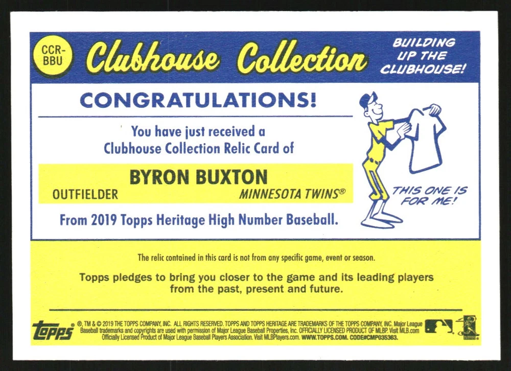 2019 Topps Heritage Clubhouse Collection Relics Gold #CCRBBU Byron Buxton HN /99 Front Back Sport: Baseball Set: 2019 Topps Heritage Clubhouse Collection Relics Gold Year: 2019 Item#: CCRBBU Player: Byron Buxton Team: Minnesota Twins Attributes: Memorabilia, Serial Numbered Brand: Topps Heritage Manufacturer: Topps Co. Grading Company: Raw Grade SetType: Parallel Insert Item Condition: Near Mint/Mint 2014 Beckett Collectibles, LLC. All Rights Reserved Powered by: Thank you for choosing Burbank Sportscards, the sports cards superstore. We offer a large selection of singles across all sports. Visit our ebay store to view all our items available. Our Shipping Policy We offer Free Standard Shipping to all Domestic customers. Options for Expedited shipping are also available at checkout. For our international customers, shipping is $9.99 for the first item, and $0.25 for each additional item. Note to all customers: To qualify for combines shipping, we ask our customers to add items into the shopping cart. Please note, we do not combine orders that are placed separately. Our Service: Generally, our turnaround is super quick as we process and send out orders same day payment is received. Stock Availability: We do our best to ensure all items are in stock; however, in case of the rare stock out, the customer will have the option for a replacement card, or we will process a refund so the order is not held up. Our Images: Many of our images are stock photos from Beckett archives. They are a representation of the actual card you would receive. If you have any questions regarding the item you're interested in, please feel free to ask (serial numbers and relic pieces may vary) Moreover, in a case of a wrong or defective photo, please notify us, so we can adjust it. Other FAQ's: -When buying multiple cards, do you top load each item? No; however, we do try to insure all items are shipped securely. If you wish to have all of your cards top loaded it is a paid service and can be arranged. Please email for more details. For other questions, please feel free to ask. Thank you.