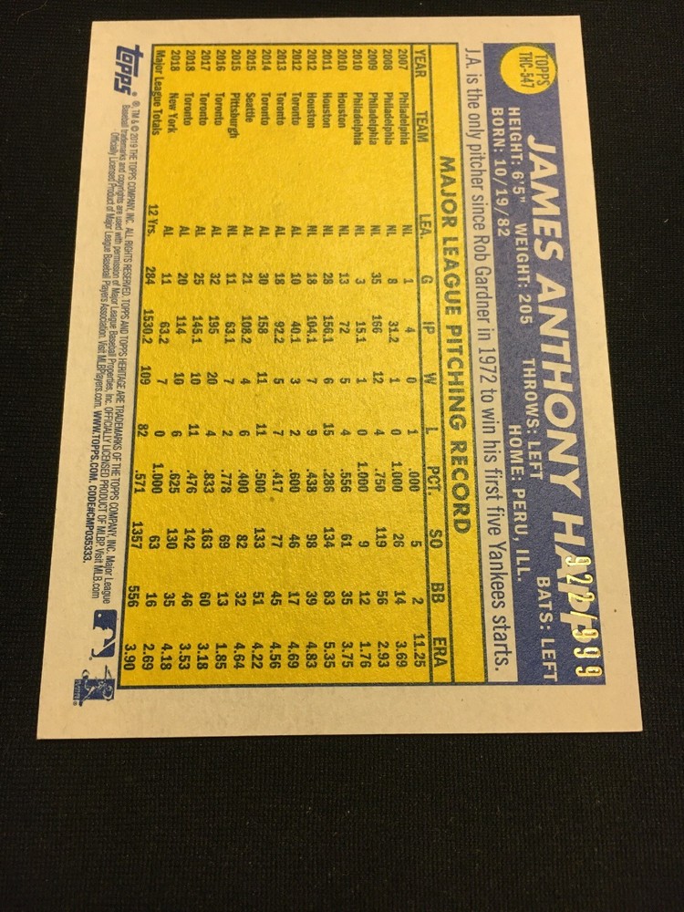Print Run:999Features:Serial Numbered, Base Set, Parallel/VarietyPlayer/Athlete:J.A. HappParallel/Variety:Chromebrand:ToppsSet:2019 Topps Heritage High NumberTeam:New York YankeesSeason:2019Card Number:THC-547Manufacturer:ToppsSeries:Topps Heritage High NumberSport:BaseballLeague:Major League Baseball (MLB)