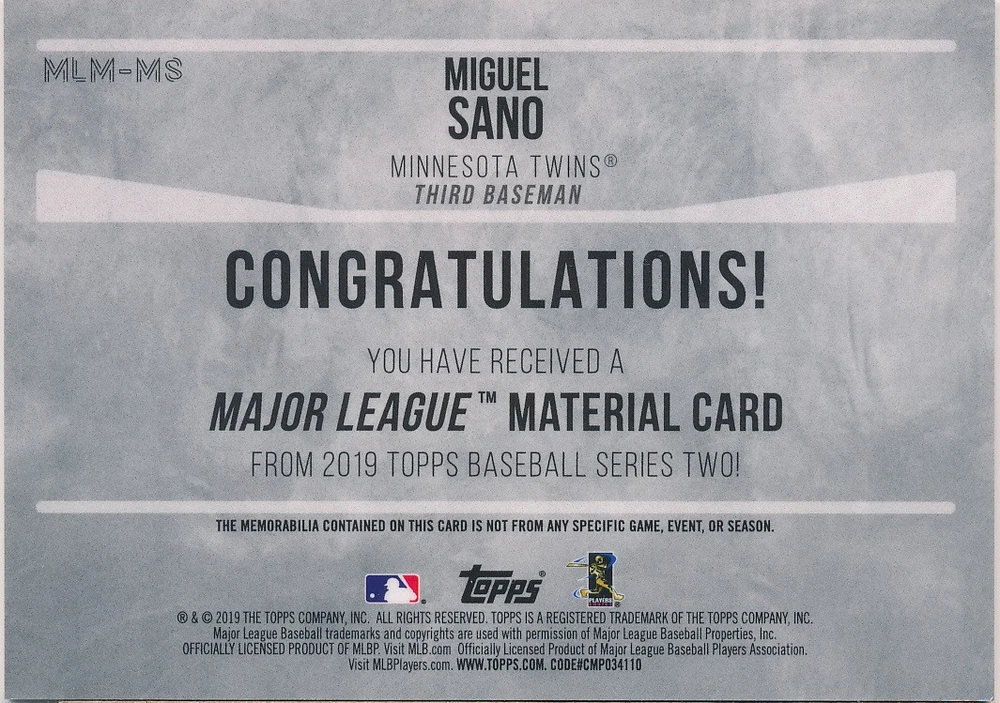 2019 Topps Major League Materials #MLMMS Miguel Sano S2 Jersey Front Back Sport: Baseball Set: 2019 Topps Major League Materials Year: 2019 Item#: MLMMS Player: Miguel Sano Team: Minnesota Twins Attributes: Memorabilia Brand: Topps Manufacturer: Topps Co. Grading Company: Raw Grade SetType: Insert Item Condition: Near Mint/Mint 2014 Beckett Collectibles, LLC. All Rights Reserved Powered by: Thank you for choosing Burbank Sportscards, the sports cards superstore. We offer a large selection of singles across all sports. Visit our ebay store to view all our items available. Our Shipping Policy We offer Free Standard Shipping to all Domestic customers. Options for Expedited shipping are also available at checkout. For our international customers, shipping is $9.99 for the first item, and $0.25 for each additional item. Note to all customers: To qualify for combines shipping, we ask our customers to add items into the shopping cart. Please note, we do not combine orders that are placed separately. Our Service: Generally, our turnaround is super quick as we process and send out orders same day payment is received. Stock Availability: We do our best to ensure all items are in stock; however, in case of the rare stock out, the customer will have the option for a replacement card, or we will process a refund so the order is not held up. Our Images: Many of our images are stock photos from Beckett archives. They are a representation of the actual card you would receive. If you have any questions regarding the item you're interested in, please feel free to ask (serial numbers and relic pieces may vary) Moreover, in a case of a wrong or defective photo, please notify us, so we can adjust it. Other FAQ's: -When buying multiple cards, do you top load each item? No; however, we do try to insure all items are shipped securely. If you wish to have all of your cards top loaded it is a paid service and can be arranged. Please email for more details. For other questions, please feel free to ask. Thank you.