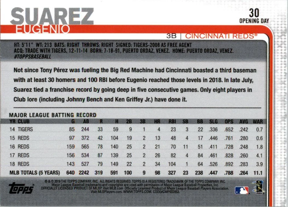 2019 Topps Opening Day Red Foil #30 Eugenio Suarez Front Back Sport: Baseball Set: 2019 Topps Opening Day Red Foil Year: 2019 Item#: 30 Player: Eugenio Suarez Team: Cincinnati Reds Brand: Topps Opening Day Manufacturer: Topps Co. Grading Company: Raw Grade SetType: Parallel Item Condition: Near Mint/Mint 2014 Beckett Collectibles, LLC. All Rights Reserved Powered by: Thank you for choosing Burbank Sportscards, the sports cards superstore. We offer a large selection of singles across all sports. Visit our ebay store to view all our items available. Our Shipping Policy We offer Free Standard Shipping to all Domestic customers. Options for Expedited shipping are also available at checkout. For our international customers, shipping is $9.99 for the first item, and $0.25 for each additional item. Note to all customers: To qualify for combines shipping, we ask our customers to add items into the shopping cart. Please note, we do not combine orders that are placed separately. Our Service: Generally, our turnaround is super quick as we process and send out orders same day payment is received. Stock Availability: We do our best to ensure all items are in stock; however, in case of the rare stock out, the customer will have the option for a replacement card, or we will process a refund so the order is not held up. Our Images: Many of our images are stock photos from Beckett archives. They are a representation of the actual card you would receive. If you have any questions regarding the item you're interested in, please feel free to ask (serial numbers and relic pieces may vary) Moreover, in a case of a wrong or defective photo, please notify us, so we can adjust it. Other FAQ's: -When buying multiple cards, do you top load each item? No; however, we do try to insure all items are shipped securely. If you wish to have all of your cards top loaded it is a paid service and can be arranged. Please email for more details. For other questions, please feel free to ask. Thank you.