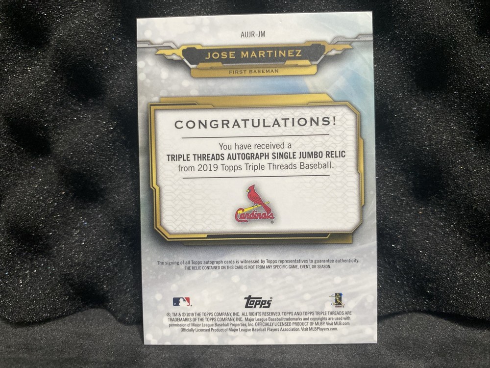 Elevate your collection with the 2019 Topps Triple Threads Single Jumbo Relics Gold card featuring St. Louis Cardinals' own Jose Martinez. A must-have for baseball aficionados, this exclusive card showcases a golden parallel variety that radiates with prestige. The card, numbered AUJR-JM, is part of a celebrated set known for its quality and craftsmanship. Crafted in 2019, this sports trading card captures Jose Martinez in his prime, making it an ideal piece for collectors and fans alike. The authenticity of the card is preserved as it comes directly from the original manufacturer, Topps, ensuring that you receive a genuine piece of baseball history.