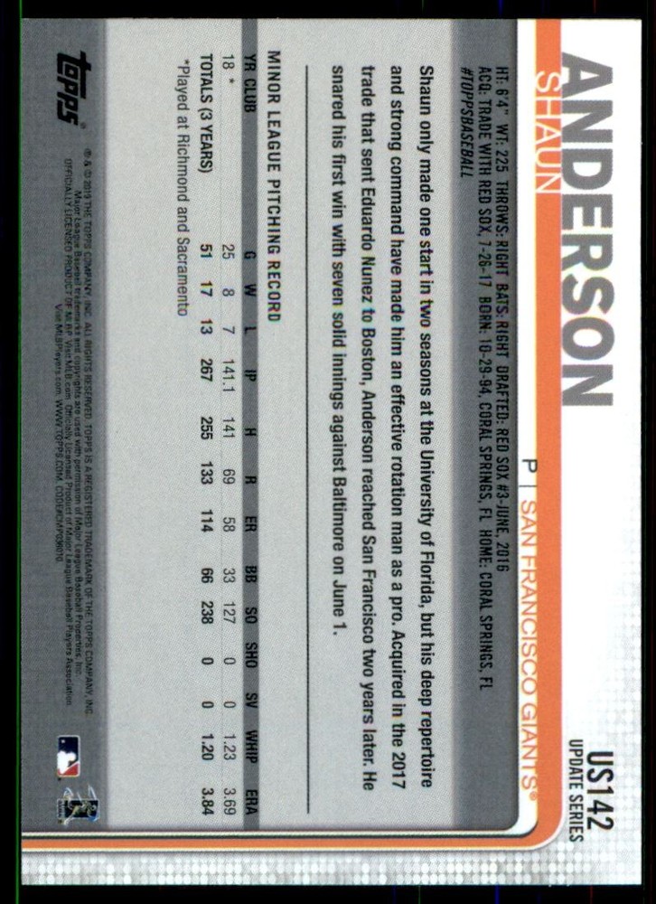 2019 Topps Update 150th Anniversary #US142 Shaun Anderson Front Back Sport: Baseball Set: 2019 Topps Update 150th Anniversary Year: 2019 Item#: US142 Player: Shaun Anderson Team: San Francisco Giants Brand: Topps Update Manufacturer: Topps Co. Grading Company: Raw Grade SetType: Parallel Item Condition: Near Mint/Mint 2014 Beckett Collectibles, LLC. All Rights Reserved Powered by: Thank you for choosing Burbank Sportscards, the sports cards superstore. We offer a large selection of singles across all sports. Visit our ebay store to view all our items available. Our Shipping Policy We offer Free Standard Shipping to all Domestic customers. Options for Expedited shipping are also available at checkout. For our international customers, shipping is $9.99 for the first item, and $0.25 for each additional item. Note to all customers: To qualify for combines shipping, we ask our customers to add items into the shopping cart. Please note, we do not combine orders that are placed separately. Our Service: Generally, our turnaround is super quick as we process and send out orders same day payment is received. Stock Availability: We do our best to ensure all items are in stock; however, in case of the rare stock out, the customer will have the option for a replacement card, or we will process a refund so the order is not held up. Our Images: Many of our images are stock photos from Beckett archives. They are a representation of the actual card you would receive. If you have any questions regarding the item you're interested in, please feel free to ask (serial numbers and relic pieces may vary) Moreover, in a case of a wrong or defective photo, please notify us, so we can adjust it. Other FAQ's: -When buying multiple cards, do you top load each item? No; however, we do try to insure all items are shipped securely. If you wish to have all of your cards top loaded it is a paid service and can be arranged. Please email for more details. For other questions, please feel free to ask. Thank you.