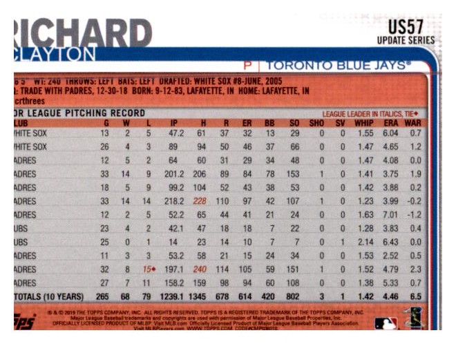 2019 Topps Update #US57 Clayton Richard Front Back Sport: Baseball Set: 2019 Topps Update Year: 2019 Item#: US57 Player: Clayton Richard Team: Toronto Blue Jays Brand: Topps Update Manufacturer: Topps Co. Grading Company: Raw Grade SetType: Main Item Condition: Near Mint/Mint 2014 Beckett Collectibles, LLC. All Rights Reserved Powered by: Thank you for choosing Burbank Sportscards, the sports cards superstore. We offer a large selection of singles across all sports. Visit our ebay store to view all our items available. Our Shipping Policy We offer Free Standard Shipping to all Domestic customers. Options for Expedited shipping are also available at checkout. For our international customers, shipping is $9.99 for the first item, and $0.25 for each additional item. Note to all customers: To qualify for combines shipping, we ask our customers to add items into the shopping cart. Please note, we do not combine orders that are placed separately. Our Service: Generally, our turnaround is super quick as we process and send out orders same day payment is received. Stock Availability: We do our best to ensure all items are in stock; however, in case of the rare stock out, the customer will have the option for a replacement card, or we will process a refund so the order is not held up. Our Images: Many of our images are stock photos from Beckett archives. They are a representation of the actual card you would receive. If you have any questions regarding the item you're interested in, please feel free to ask (serial numbers and relic pieces may vary) Moreover, in a case of a wrong or defective photo, please notify us, so we can adjust it. Other FAQ's: -When buying multiple cards, do you top load each item? No; however, we do try to insure all items are shipped securely. If you wish to have all of your cards top loaded it is a paid service and can be arranged. Please email for more details. For other questions, please feel free to ask. Thank you.