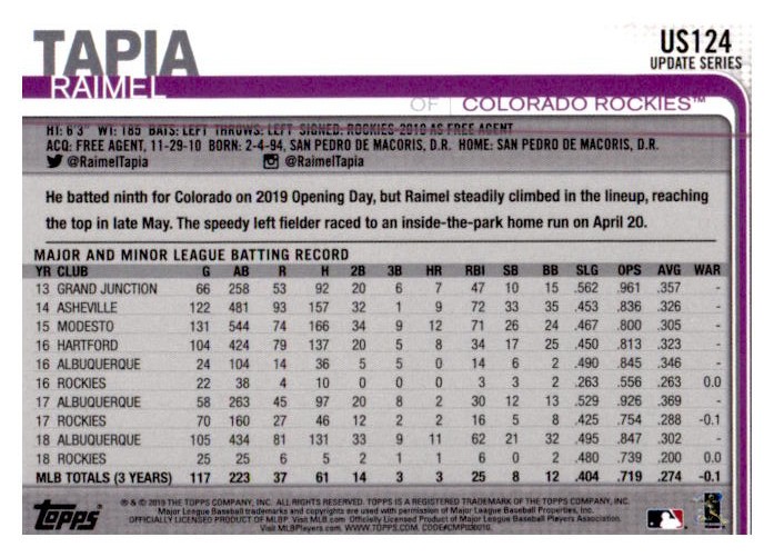 2019 Topps Update #US124 Raimel Tapia Front Back Sport: Baseball Set: 2019 Topps Update Year: 2019 Item#: US124 Player: Raimel Tapia Team: Colorado Rockies BB Brand: Topps Update Manufacturer: Topps Co. Grading Company: Raw Grade SetType: Main Item Condition: Near Mint/Mint 2014 Beckett Collectibles, LLC. All Rights Reserved Powered by: Thank you for choosing Burbank Sportscards, the sports cards superstore. We offer a large selection of singles across all sports. Visit our ebay store to view all our items available. Our Shipping Policy We offer Free Standard Shipping to all Domestic customers. Options for Expedited shipping are also available at checkout. For our international customers, shipping is $9.99 for the first item, and $0.25 for each additional item. Note to all customers: To qualify for combines shipping, we ask our customers to add items into the shopping cart. Please note, we do not combine orders that are placed separately. Our Service: Generally, our turnaround is super quick as we process and send out orders same day payment is received. Stock Availability: We do our best to ensure all items are in stock; however, in case of the rare stock out, the customer will have the option for a replacement card, or we will process a refund so the order is not held up. Our Images: Many of our images are stock photos from Beckett archives. They are a representation of the actual card you would receive. If you have any questions regarding the item you're interested in, please feel free to ask (serial numbers and relic pieces may vary) Moreover, in a case of a wrong or defective photo, please notify us, so we can adjust it. Other FAQ's: -When buying multiple cards, do you top load each item? No; however, we do try to insure all items are shipped securely. If you wish to have all of your cards top loaded it is a paid service and can be arranged. Please email for more details. For other questions, please feel free to ask. Thank you.