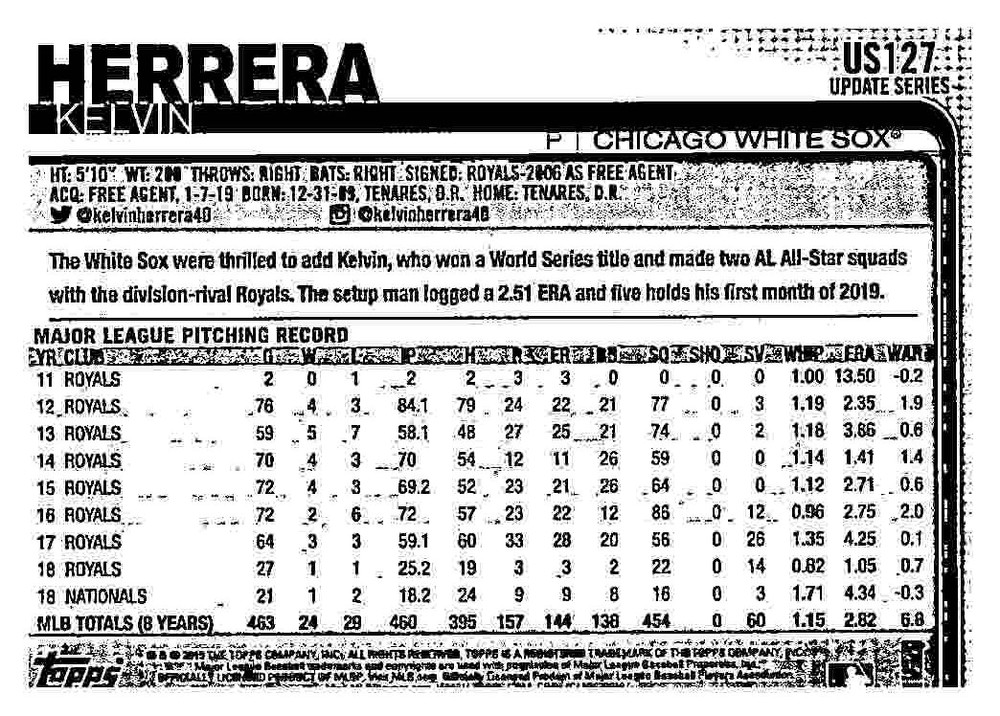 2019 Topps Update #US127 Kelvin Herrera Front Back Sport: Baseball Set: 2019 Topps Update Year: 2019 Item#: US127 Player: Kelvin Herrera Team: Chicago White Sox Brand: Topps Update Manufacturer: Topps Co. Grading Company: Raw Grade SetType: Main Item Condition: Near Mint/Mint 2014 Beckett Collectibles, LLC. All Rights Reserved Powered by: Thank you for choosing Burbank Sportscards, the sports cards superstore. We offer a large selection of singles across all sports. Visit our ebay store to view all our items available. Our Shipping Policy We offer Free Standard Shipping to all Domestic customers. Options for Expedited shipping are also available at checkout. For our international customers, shipping is $9.99 for the first item, and $0.25 for each additional item. Note to all customers: To qualify for combines shipping, we ask our customers to add items into the shopping cart. Please note, we do not combine orders that are placed separately. Our Service: Generally, our turnaround is super quick as we process and send out orders same day payment is received. Stock Availability: We do our best to ensure all items are in stock; however, in case of the rare stock out, the customer will have the option for a replacement card, or we will process a refund so the order is not held up. Our Images: Many of our images are stock photos from Beckett archives. They are a representation of the actual card you would receive. If you have any questions regarding the item you're interested in, please feel free to ask (serial numbers and relic pieces may vary) Moreover, in a case of a wrong or defective photo, please notify us, so we can adjust it. Other FAQ's: -When buying multiple cards, do you top load each item? No; however, we do try to insure all items are shipped securely. If you wish to have all of your cards top loaded it is a paid service and can be arranged. Please email for more details. For other questions, please feel free to ask. Thank you.
