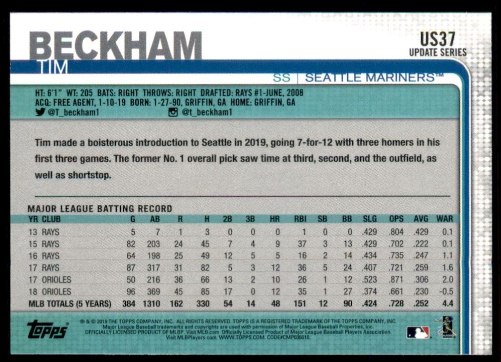 This 2019 Topps Update Tim Beckham card is a great addition to any Mariners or baseball card collection! The near mint/mint condition is crisp, with sharp colors and clean edges. Perfect for fans who appreciate quality singles without the high cost of graded cards. Fast shipping and reliable seller—highly recommend for collectors!