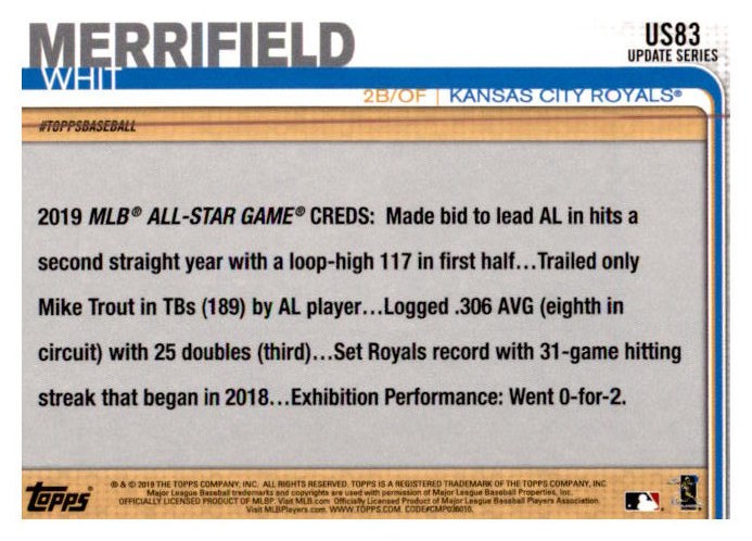 This 2019 Topps Update Whit Merrifield AS card is a sharp addition for any Royals fan or collector! The near mint/mint condition shows crisp details on both front and back, capturing Merrifield’s All-Star moment perfectly. A great pick for set builders or those chasing KC memorabilia—solid quality and a must-have for baseball card enthusiasts. Burbank Sportscards delivers again with a reliable purchase!