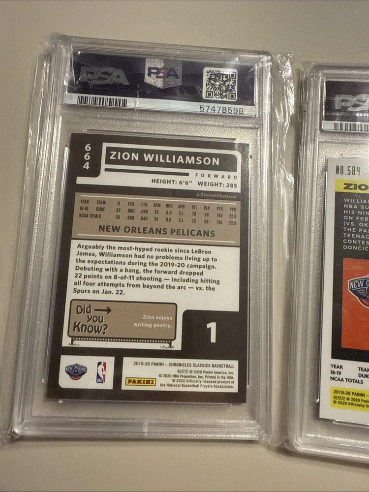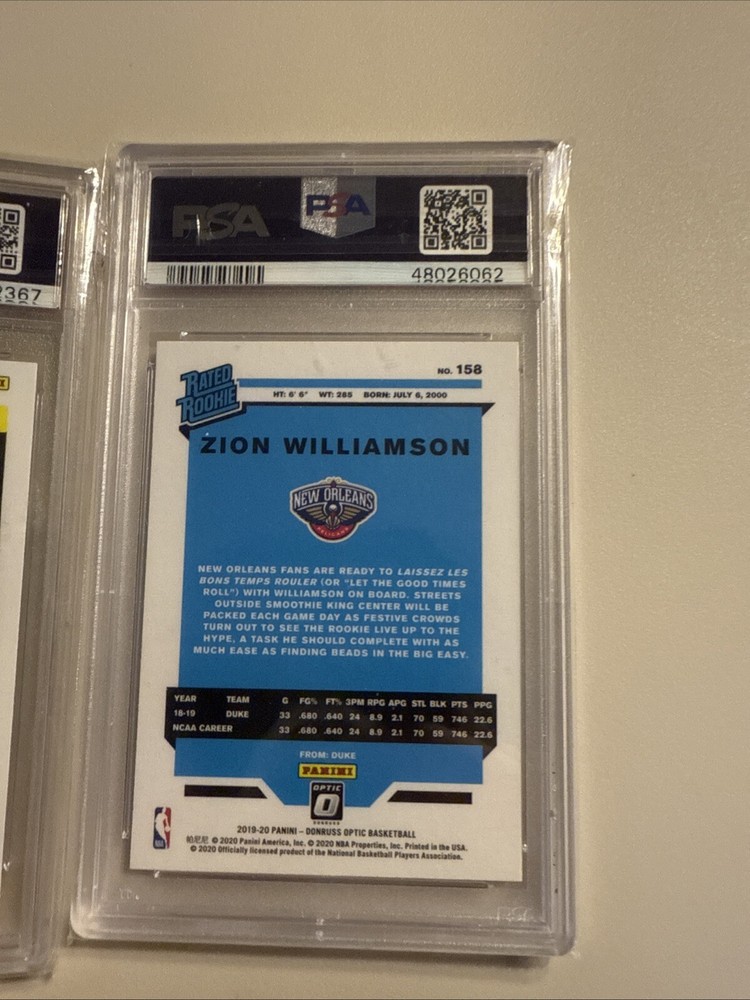 The product is a 2019 Panini Donruss Optic trading card featuring Zion Williamson, a rookie player from Duke Blue Devils and New Orleans Pelicans in the NBA. The card is numbered 158 and has been graded as a PSA 9, indicating it is in mint condition. This card is part of a lot of Zion Williamson cards from the 2019-20 season, offering collectors the chance to own a piece of memorabilia from this highly sought-after basketball player. 4 cards total 2019 Chronicles Rookie Card - psa 9 2019 Flux Rookie Card - psa 10 2019 Donruss Optic Rated Rookie - psa 9 2019 Hoops Rookie - psa 9