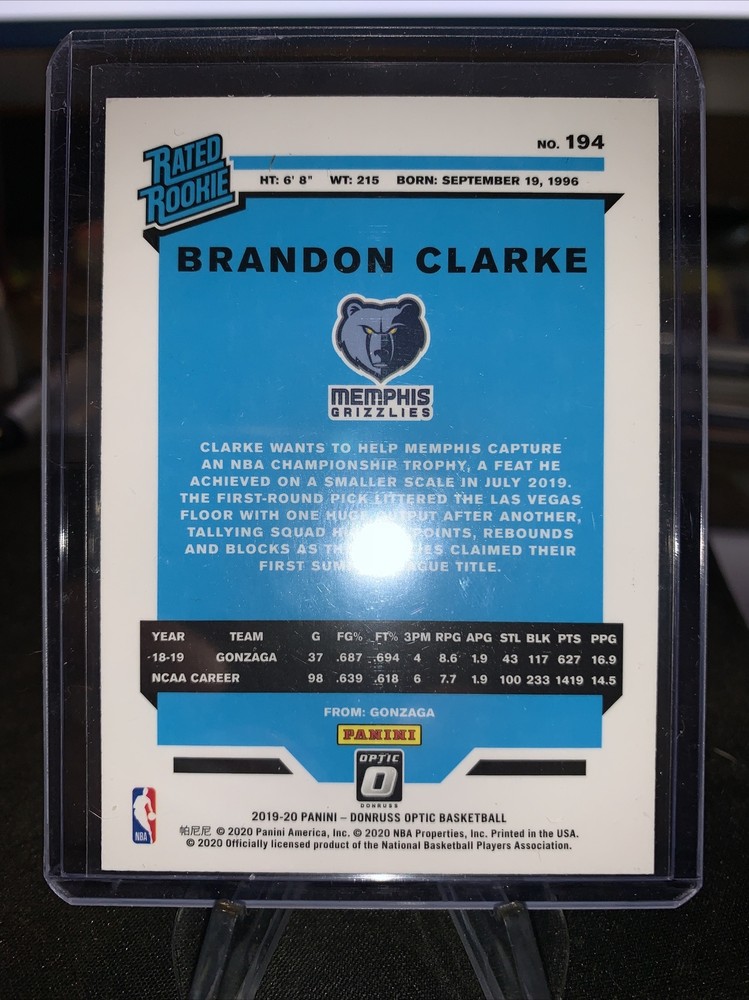 2019-20 Optic Brandon Clarke RC Base Rated Rookie #194 Grizzlies The card pictured is the card you will receive. It will be sent in a penny sleeve inside a top loader and mailed in a bubble mailer.