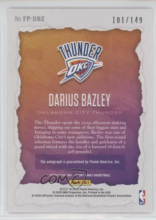 2019-20 Panini Court Kings - Fresh Paint #FP-DBZ Darius Bazley Qty Made: 149 - Rookie - Basketball Card - Featuring the Oklahoma City Thunder - Featuring Darius Bazley Search for more: 2019-20 Panini Court Kings Search for more: 2019-20 Panini Court Kings - Fresh Paint View all of our Listings Auctions Buy It Now About Us Located in the beautiful Pacific Northwest, COMC (Check Out My Cards) is the world's largest consignment service for trading card singles. More than 10,000 people have used our consignment service to list over 50 million trading cards. We currently house 20 million cards, each listed for sale with front and back images of the actual card. Find out how we can help you consign your items on eBay by contacting us through eBay messaging. COMC -- "The Safe & Easy Way to Buy & Sell" Representative Image - Select Specific Item above to see image of actual item Representative Image - Select Specific Item above to see image of actual item Raw Condition for Modern Cards Unless otherwise noted, raw modern cards are listed in Near Mint-Mint condition or better. A NM-MT card appears to be Mint at first glance, but upon closer inspection, may exhibit some of the following: minor print defects (e.g. roller marks, print line, dimple), minor scratches, slight edge wear, and slight corner wear. Centering is clearly visible in the images provided and does not factor into our condition assessment. Raw Condition for Vintage Cards Unless otherwise noted, raw vintage cards are listed in Excellent condition or better. An EX card may exhibit some of the following: minor rounding of corners, surface wear, print defects, light scratches, and slight edge wear/chipping. Centering is clearly visible in the images provided and does not factor into our condition assessment. Domestic Shipping Combined shipping for multiple items is available. To receive combined shipping, please ensure all desired items are in your eBay shopping cart before proceeding to checkout. eBay limits orders to 40 items per order. We automatically combine multiple orders placed on the same day. If you place multiple orders on the same day, please contact us to request a refund of applicable shipping costs. Signature confirmation may be required on invoices over $400. Raw cards are shipped in toploaders. International Shipping COMC offers eBay's International Shipping (EIS) for international orders under $2,500* (see country exceptions below). All duties and import fees are paid at checkout; in the rare event that there are additional import fees upon delivery, these are borne by the buyer. EIS packages route through a shipping hub in Erlanger, KY before shipping to their final destination. Please note that EIS does not allow for combined shipments. The shipping rates are determined by eBay and cannot be adjusted. *Maximum sale price exceptions: Colombia, Kuwait ($2,000); Taiwan ($1,539); Chile, Costa Rica, Guatemala, Honduras, Trinidad and Tobago ($1,000); Antigua and Barbuda, Aruba, Belize, Dominica, Grenada, Philippines, Saint Kitts and Nevis, Saint Lucia, Montserrat, Turks and Caicos Islands ($500); Dominican Republic, El Salvador ($200). Please request a shipping quote through eBay messaging for orders that exceed the maximum sale price supported by eBay's International Shipping. You will be responsible for all duties and import fees for international orders shipped outside the EIS. Raw cards are shipped in toploaders. Payment COMC does not accept offers on our cards through our eBay storefront. COMC utilizes eBay’s managed payments system. If you are experiencing difficulties making a payment, please contact eBay for assistance. Return Policy Returns are only accepted on the rare occasion the item is not as described. If you are making a return, please initiate the return process through eBay so a mailing label can be provided for you. Prior to listing, our expert team carefully assessed this item to represent it accurately. Please review the description and high-definition images prior to purchasing to ensure this item meets your satisfaction. We welcome you to contact us if you have further questions about this item. Trust and Integrity COMC carefully assesses each item consigned to us to prevent fraudulent items from entering the marketplace. If you believe an item offered on COMC may be fraudulent, please contact us with details so we can investigate the issue. Items we determine are outside our supported items policy may be removed. Last Modified: 1/17/2025 1:57:29 AM PDT