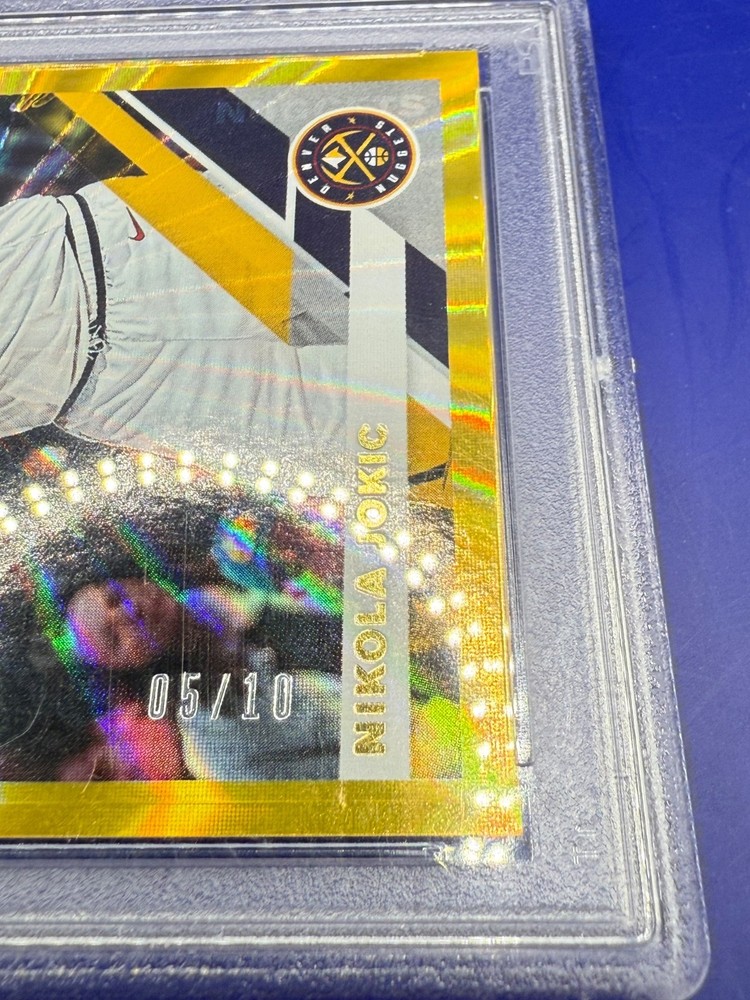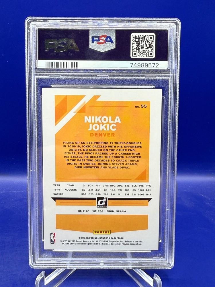 The product is a rare and highly collectible 2019-20 Panini Donruss NIKOLA JOKIC Press Proof Gold Laser trading card numbered #55. This limited edition card features a serial number of 05/10, making it one of only a few in existence. With a PSA 9 grading, this card is in excellent condition and showcases the talented NBA player in a unique parallel variety design. Ideal for basketball card collectors and fans of the Denver Nuggets, this card is a valuable addition to any sports memorabilia collection.