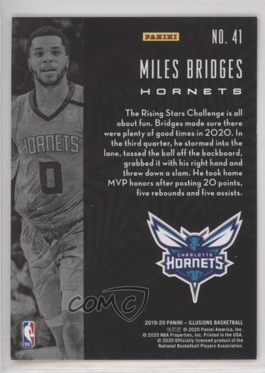 2019-20 Panini Illusions - [Base] - Trophy Collection Sapphire #41 Miles Bridges - Basketball Card - Featuring the Charlotte Hornets - Featuring Miles Bridges Search for more: 2019-20 Panini Illusions Search for more: 2019-20 Panini Illusions - [Base] - Trophy Collection Sapphire View all of our Listings Auctions Buy It Now About Us Located in the beautiful Pacific Northwest, COMC (Check Out My Cards) is the world's largest consignment service for trading card singles. More than 10,000 people have used our consignment service to list over 50 million trading cards. We currently house 20 million cards, each listed for sale with front and back images of the actual card. Find out how we can help you consign your items on eBay by contacting us through eBay messaging. COMC -- "The Safe & Easy Way to Buy & Sell" Representative Image - Select Specific Item above to see image of actual item Representative Image - Select Specific Item above to see image of actual item Raw Condition for Modern Cards Unless otherwise noted, raw modern cards are listed in Near Mint-Mint condition or better. A NM-MT card appears to be Mint at first glance, but upon closer inspection, may exhibit some of the following: minor print defects (e.g. roller marks, print line, dimple), minor scratches, slight edge wear, and slight corner wear. Centering is clearly visible in the images provided and does not factor into our condition assessment. Raw Condition for Vintage Cards Unless otherwise noted, raw vintage cards are listed in Excellent condition or better. An EX card may exhibit some of the following: minor rounding of corners, surface wear, print defects, light scratches, and slight edge wear/chipping. Centering is clearly visible in the images provided and does not factor into our condition assessment. Domestic Shipping Combined shipping for multiple items is available. To receive combined shipping, please ensure all desired items are in your eBay shopping cart before proceeding to checkout. eBay limits orders to 40 items per order. We automatically combine multiple orders placed on the same day. If you place multiple orders on the same day, please contact us to request a refund of applicable shipping costs. Signature confirmation may be required on invoices over $400. Raw cards are shipped in toploaders. International Shipping COMC offers eBay's International Shipping (EIS) for international orders under $2,500* (see country exceptions below). All duties and import fees are paid at checkout; in the rare event that there are additional import fees upon delivery, these are borne by the buyer. EIS packages route through a shipping hub in Erlanger, KY before shipping to their final destination. Please note that EIS does not allow for combined shipments. The shipping rates are determined by eBay and cannot be adjusted. *Maximum sale price exceptions: Colombia, Kuwait ($2,000); Taiwan ($1,539); Chile, Costa Rica, Guatemala, Honduras, Trinidad and Tobago ($1,000); Antigua and Barbuda, Aruba, Belize, Dominica, Grenada, Philippines, Saint Kitts and Nevis, Saint Lucia, Montserrat, Turks and Caicos Islands ($500); Dominican Republic, El Salvador ($200). Please request a shipping quote through eBay messaging for orders that exceed the maximum sale price supported by eBay's International Shipping. You will be responsible for all duties and import fees for international orders shipped outside the EIS. Raw cards are shipped in toploaders. Payment COMC does not accept offers on our cards through our eBay storefront. COMC utilizes eBay’s managed payments system. If you are experiencing difficulties making a payment, please contact eBay for assistance. Return Policy Returns are only accepted on the rare occasion the item is not as described. If you are making a return, please initiate the return process through eBay so a mailing label can be provided for you. Prior to listing, our expert team carefully assessed this item to represent it accurately. Please review the description and high-definition images prior to purchasing to ensure this item meets your satisfaction. We welcome you to contact us if you have further questions about this item. Trust and Integrity COMC carefully assesses each item consigned to us to prevent fraudulent items from entering the marketplace. If you believe an item offered on COMC may be fraudulent, please contact us with details so we can investigate the issue. Items we determine are outside our supported items policy may be removed. Last Modified: 11/30/2024 10:51:39 PM PDT