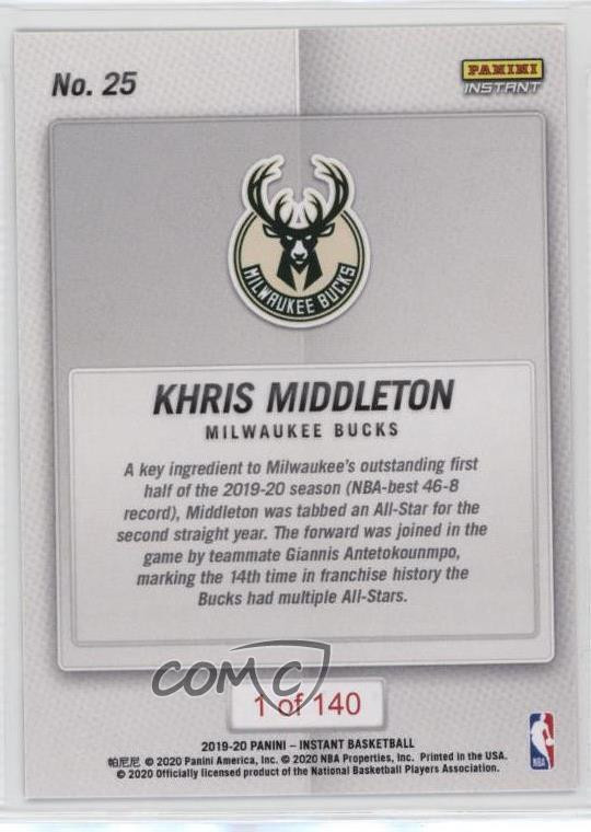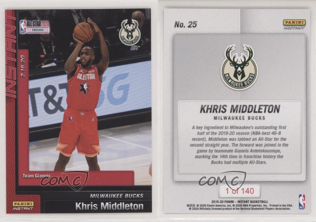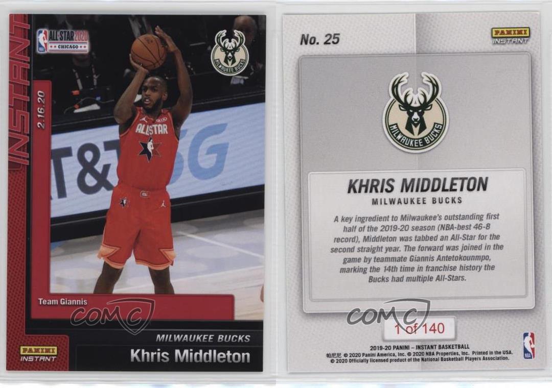 2019-20 Panini Instant - All-Star Game #25 Khris Middleton Qty Made: 140 - Basketball Card - Featuring the Milwaukee Bucks - Featuring Khris Middleton Search for more: 2019-20 Panini Instant Search for more: 2019-20 Panini Instant - All-Star Game View all of our Listings Auctions Buy It Now About Us Located in the beautiful Pacific Northwest, COMC (Check Out My Cards) is the world's largest consignment service for trading card singles. More than 10,000 people have used our consignment service to list over 50 million trading cards. Find out how we can help you consign your items on eBay by contacting us through eBay messaging. COMC -- "The Safe & Easy Way to Buy & Sell" Representative Image - Select Specific Item above to see image of actual item Representative Image - Select Specific Item above to see image of actual item Raw Condition for Modern Cards Unless otherwise noted, raw modern cards are listed in Near Mint-Mint condition or better. A NM-MT card appears to be Mint at first glance, but upon closer inspection, may exhibit some of the following: minor print defects (e.g. roller marks, print line, dimple), minor scratches, slight edge wear, and slight corner wear. Centering is clearly visible in the images provided and does not factor into our condition assessment. Raw Condition for Vintage Cards Unless otherwise noted, raw vintage cards are listed in Excellent condition or better. An EX card may exhibit some of the following: minor rounding of corners, surface wear, print defects, light scratches, and slight edge wear/chipping. Centering is clearly visible in the images provided and does not factor into our condition assessment. Domestic Shipping Combined shipping for multiple items is available. To receive combined shipping, please ensure all desired items are in your eBay shopping cart before proceeding to checkout. eBay limits orders to 40 items per order. We automatically combine multiple orders placed on the same day. If you place multiple orders on the same day, please contact us to request a refund of applicable shipping costs. Signature confirmation may be required on invoices over $400. All cards are protected and shipped securely. International Shipping COMC offers eBay's International Shipping (EIS) for international orders under $2,500* (see country exceptions below). All duties and import fees are paid at checkout; in the rare event that there are additional import fees upon delivery, these are borne by the buyer. EIS packages route through a shipping hub in Erlanger, KY before shipping to their final destination. Please note that EIS does not allow for combined shipments. The shipping rates are determined by eBay and cannot be adjusted. *Maximum sale price exceptions: Colombia, Kuwait ($2,000); Taiwan ($1,539); Chile, Costa Rica, Guatemala, Honduras, Trinidad and Tobago ($1,000); Antigua and Barbuda, Aruba, Belize, Dominica, Grenada, Philippines, Saint Kitts and Nevis, Saint Lucia, Montserrat, Turks and Caicos Islands ($500); Dominican Republic, El Salvador ($200). Please request a shipping quote through eBay messaging for orders that exceed the maximum sale price supported by eBay's International Shipping. You will be responsible for all duties and import fees for international orders shipped outside the EIS. All cards are protected and shipped securely. Payment COMC does not accept offers on our cards through our eBay storefront. COMC utilizes eBay’s managed payments system. If you are experiencing difficulties making a payment, please contact eBay for assistance. Return Policy Returns are only accepted on the rare occasion the item is not as described. If you are making a return, please initiate the return process through eBay so a mailing label can be provided for you. Prior to listing, our expert team carefully assessed this item to represent it accurately. Please review the description and high-definition images prior to purchasing to ensure this item meets your satisfaction. We welcome you to contact us if you have further questions about this item. Trust and Integrity COMC carefully assesses each item consigned to us to prevent fraudulent items from entering the marketplace. If you believe an item offered on COMC may be fraudulent, please contact us with details so we can investigate the issue. Items we determine are outside our supported items policy may be removed. Last Modified: 3/15/2025 11:41:21 AM PDT
