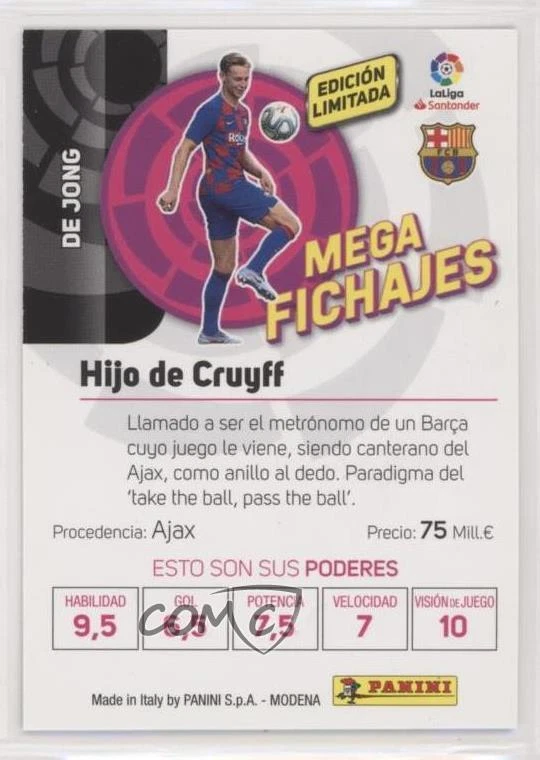 2019-20 Panini Megacracks MGK La Liga - Limited Edition #_FRDJ Frenkie de Jong - Soccer Card - Featuring the FC Barcelona - Featuring Frenkie de Jong Search for more: 2019-20 Panini Megacracks MGK La Liga Search for more: 2019-20 Panini Megacracks MGK La Liga - Limited Edition View all of our Listings Auctions Buy It Now About Us Located in the beautiful Pacific Northwest, COMC (Check Out My Cards) is the world's largest consignment service for trading card singles. More than 10,000 people have used our consignment service to list over 50 million trading cards. We currently house 20 million cards, each listed for sale with front and back images of the actual card. Find out how we can help you consign your items on eBay by contacting us through eBay messaging. COMC -- "The Safe & Easy Way to Buy & Sell" Representative Image - Select Specific Item above to see image of actual item Representative Image - Select Specific Item above to see image of actual item Raw Condition for Modern Cards Unless otherwise noted, raw modern cards are listed in Near Mint-Mint condition or better. A NM-MT card appears to be Mint at first glance, but upon closer inspection, may exhibit some of the following: minor print defects (e.g. roller marks, print line, dimple), minor scratches, slight edge wear, and slight corner wear. Centering is clearly visible in the images provided and does not factor into our condition assessment. Raw Condition for Vintage Cards Unless otherwise noted, raw vintage cards are listed in Excellent condition or better. An EX card may exhibit some of the following: minor rounding of corners, surface wear, print defects, light scratches, and slight edge wear/chipping. Centering is clearly visible in the images provided and does not factor into our condition assessment. Domestic Shipping Combined shipping for multiple items is available. To receive combined shipping, please ensure all desired items are in your eBay shopping cart before proceeding to checkout. eBay limits orders to 40 items per order. We automatically combine multiple orders placed on the same day. If you place multiple orders on the same day, please contact us to request a refund of applicable shipping costs. Signature confirmation may be required on invoices over $400. Raw cards are shipped in toploaders. International Shipping COMC offers eBay's International Shipping (EIS) for international orders under $2,500* (see country exceptions below). All duties and import fees are paid at checkout; in the rare event that there are additional import fees upon delivery, these are borne by the buyer. EIS packages route through a shipping hub in Erlanger, KY before shipping to their final destination. Please note that EIS does not allow for combined shipments. The shipping rates are determined by eBay and cannot be adjusted. *Maximum sale price exceptions: Colombia, Kuwait ($2,000); Taiwan ($1,539); Chile, Costa Rica, Guatemala, Honduras, Trinidad and Tobago ($1,000); Antigua and Barbuda, Aruba, Belize, Dominica, Grenada, Philippines, Saint Kitts and Nevis, Saint Lucia, Montserrat, Turks and Caicos Islands ($500); Dominican Republic, El Salvador ($200). Please request a shipping quote through eBay messaging for orders that exceed the maximum sale price supported by eBay's International Shipping. You will be responsible for all duties and import fees for international orders shipped outside the EIS. Raw cards are shipped in toploaders. Payment COMC does not accept offers on our cards through our eBay storefront. COMC utilizes eBay’s managed payments system. If you are experiencing difficulties making a payment, please contact eBay for assistance. Return Policy Returns are only accepted on the rare occasion the item is not as described. If you are making a return, please initiate the return process through eBay so a mailing label can be provided for you. Prior to listing, our expert team carefully assessed this item to represent it accurately. Please review the description and high-definition images prior to purchasing to ensure this item meets your satisfaction. We welcome you to contact us if you have further questions about this item. Trust and Integrity COMC carefully assesses each item consigned to us to prevent fraudulent items from entering the marketplace. If you believe an item offered on COMC may be fraudulent, please contact us with details so we can investigate the issue. Items we determine are outside our supported items policy may be removed. Last Modified: 10/18/2024 9:59:51 PM PDT