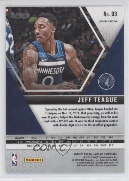 2019-20 Panini Mosaic - [Base] - Silver Prizm #93 Jeff Teague - Basketball Card - Featuring the Minnesota Timberwolves - Featuring Jeff Teague Search for more: 2019-20 Panini Mosaic Search for more: 2019-20 Panini Mosaic - [Base] - Silver Prizm View all of our Listings Auctions Buy It Now About Us Located in the beautiful Pacific Northwest, COMC (Check Out My Cards) is the world's largest consignment service for trading card singles. More than 10,000 people have used our consignment service to list over 50 million trading cards. We currently house 20 million cards, each listed for sale with front and back images of the actual card. Find out how we can help you consign your items on eBay by contacting us through eBay messaging. COMC -- "The Safe & Easy Way to Buy & Sell" Representative Image - Select Specific Item above to see image of actual item Representative Image - Select Specific Item above to see image of actual item Raw Condition for Modern Cards Unless otherwise noted, raw modern cards are listed in Near Mint-Mint condition or better. A NM-MT card appears to be Mint at first glance, but upon closer inspection, may exhibit some of the following: minor print defects (e.g. roller marks, print line, dimple), minor scratches, slight edge wear, and slight corner wear. Centering is clearly visible in the images provided and does not factor into our condition assessment. Raw Condition for Vintage Cards Unless otherwise noted, raw vintage cards are listed in Excellent condition or better. An EX card may exhibit some of the following: minor rounding of corners, surface wear, print defects, light scratches, and slight edge wear/chipping. Centering is clearly visible in the images provided and does not factor into our condition assessment. Domestic Shipping Combined shipping for multiple items is available. To receive combined shipping, please ensure all desired items are in your eBay shopping cart before proceeding to checkout. eBay limits orders to 40 items per order. We automatically combine multiple orders placed on the same day. If you place multiple orders on the same day, please contact us to request a refund of applicable shipping costs. Signature confirmation may be required on invoices over $400. Raw cards are shipped in toploaders. International Shipping COMC offers eBay's International Shipping (EIS) for international orders under $2,500* (see country exceptions below). All duties and import fees are paid at checkout; in the rare event that there are additional import fees upon delivery, these are borne by the buyer. EIS packages route through a shipping hub in Erlanger, KY before shipping to their final destination. Please note that EIS does not allow for combined shipments. The shipping rates are determined by eBay and cannot be adjusted. *Maximum sale price exceptions: Colombia, Kuwait ($2,000); Taiwan ($1,539); Chile, Costa Rica, Guatemala, Honduras, Trinidad and Tobago ($1,000); Antigua and Barbuda, Aruba, Belize, Dominica, Grenada, Philippines, Saint Kitts and Nevis, Saint Lucia, Montserrat, Turks and Caicos Islands ($500); Dominican Republic, El Salvador ($200). Please request a shipping quote through eBay messaging for orders that exceed the maximum sale price supported by eBay's International Shipping. You will be responsible for all duties and import fees for international orders shipped outside the EIS. Raw cards are shipped in toploaders. Payment COMC does not accept offers on our cards through our eBay storefront. COMC utilizes eBayโs managed payments system. If you are experiencing difficulties making a payment, please contact eBay for assistance. Return Policy Returns are only accepted on the rare occasion the item is not as described. If you are making a return, please initiate the return process through eBay so a mailing label can be provided for you. Prior to listing, our expert team carefully assessed this item to represent it accurately. Please review the description and high-definition images prior to purchasing to ensure this item meets your satisfaction. We welcome you to contact us if you have further questions about this item. Trust and Integrity COMC carefully assesses each item consigned to us to prevent fraudulent items from entering the marketplace. If you believe an item offered on COMC may be fraudulent, please contact us with details so we can investigate the issue. Items we determine are outside our supported items policy may be removed. Last Modified: 10/20/2024 3:49:49 AM PDT